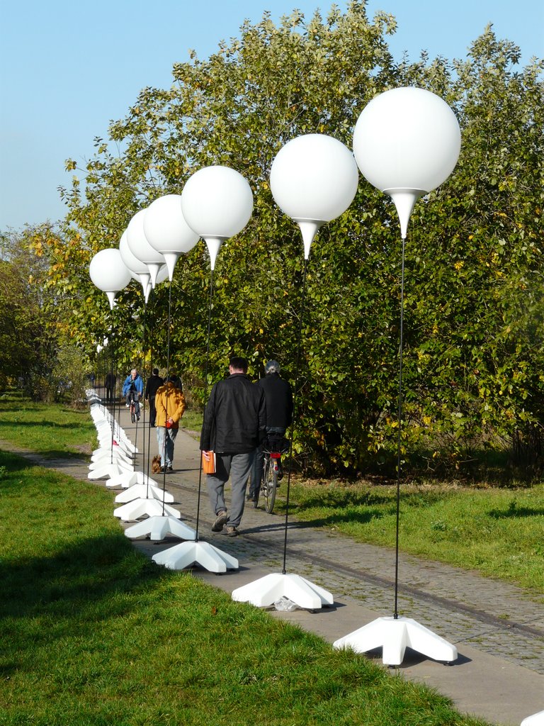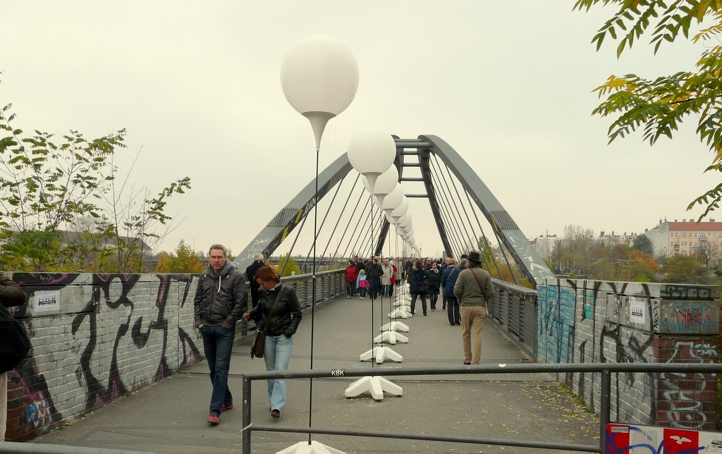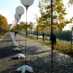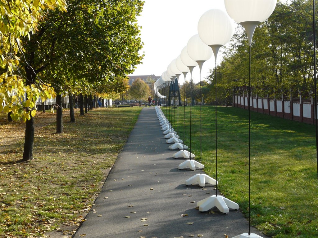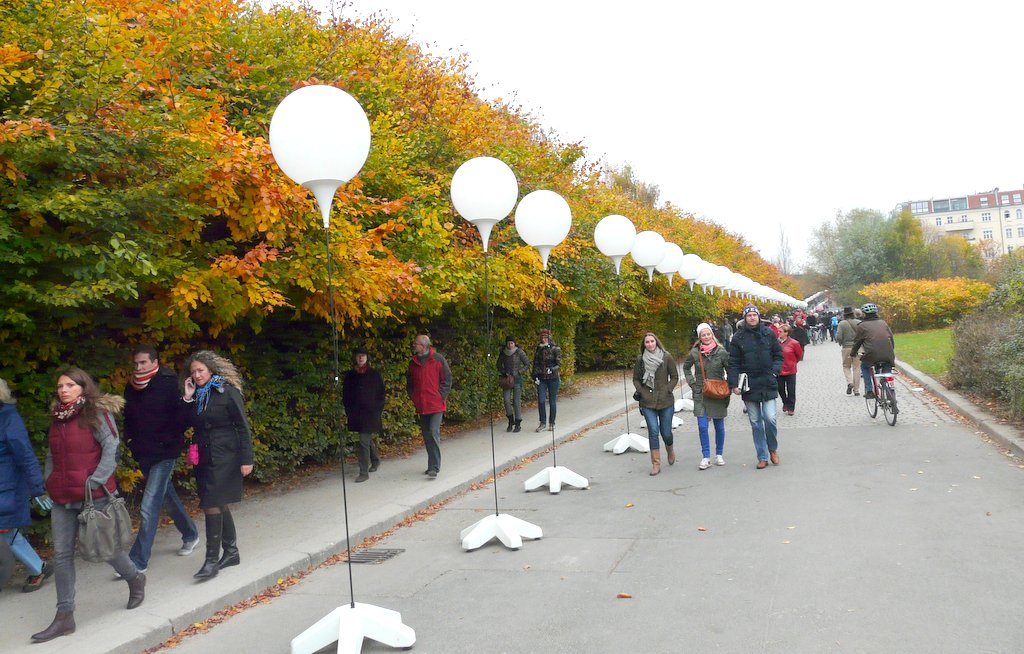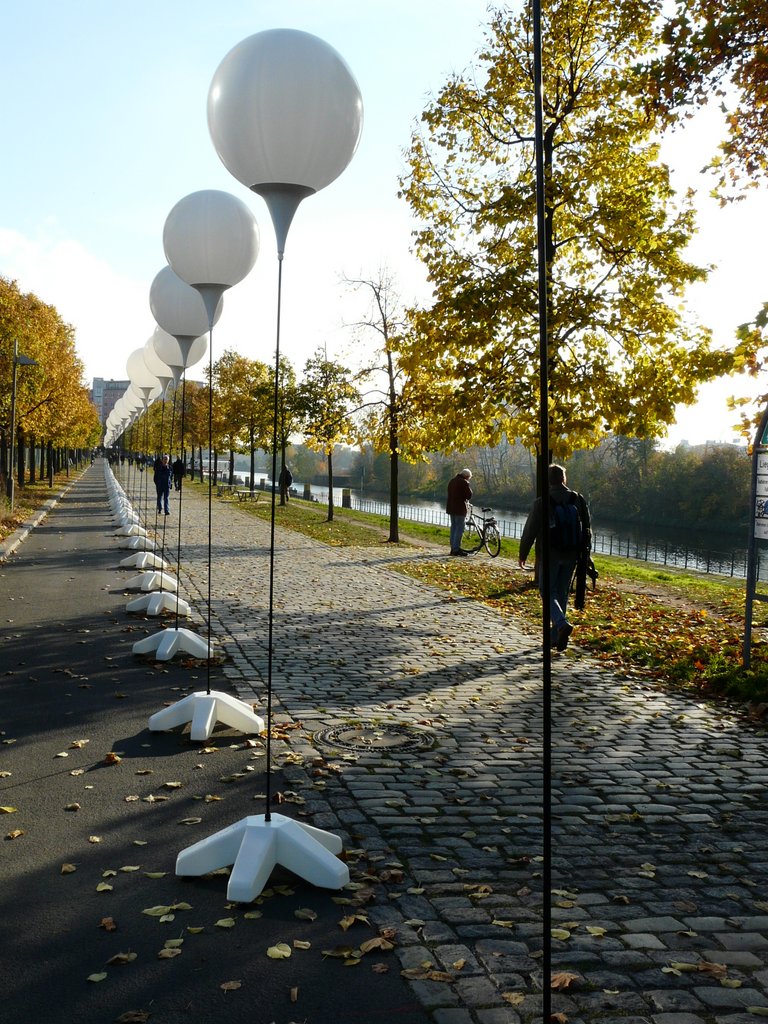 8000 weiße Ballons stellten als „Lichtgrenze“ den ehemaligen Verlauf der Berliner Mauer nach – auf 15 Kilometer, von der Bornholmerstr. im Norden über die Bernauerstr., vorbei am Reichstag, dem Brandenburger Tor, dem Potsdamer Platz und Checkpoint Charlie bis zur East Side Gallery und der Oberbaumbrücke im Süden.