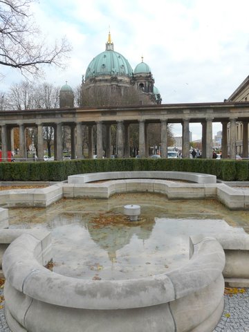 Wir fahren mit unseren Fahrrädern weiter durch den Lustgarten, genießen herbstlich farbige Blicke auf die imposanten Gebäude der Museumsinsel hinter uns, den Dom zur Linken und das Deutsche Historische Museum zur Rechten. Der Herbsttag und die eindrucksvollen Gebäude spiegeln sich malerisch im Wasser der Spree.