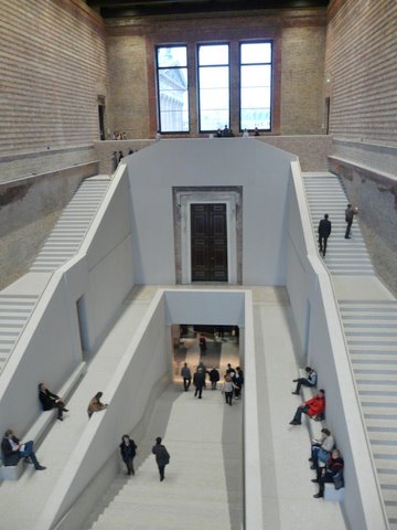 Das Ergebnis dieses ambitionierten Auftrags ist ein Wunderwerk alter und neuer Architektur. Der noch vorhandene Klassizismus und Historismus des Gebäudetorsos um 1855 wurde von Chipperfield sensibel restauriert und mit strenger, moderner Architektur ergänzt. Insofern stößt man im Museum ständig auf alte und neue Elemente, die sich vortrefflich verbinden. Ein erster Höhepunkt ist zweifellos die moderne Treppenhalle, die sich, eingefasst von altem Gemäuer, puristisch in strahlendem Weiß präsentiert, tagesbelichtet von 6 Meter hohen Fenstern.