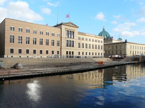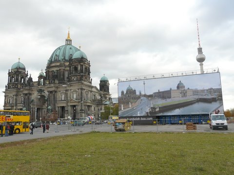 Auf der riesigen Grünfläche, auf der zu DDR-Zeiten der protzige Palast der Republik stand, begrüßt uns ein Großplakat, das diesen Platz nach dem Wiederaufbau des historischen Schlosses simuliert. Der Wiederaufbau ist zwar umstritten, die Simulation zeigt aber ein harmonisches, geschlossenes Ensemble von Lustgarten, Dom und Schloss, bewacht vom Fernsehturm am Alex – vorwärts, zurück in unsere preußische Vergangenheit!