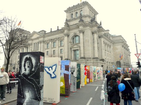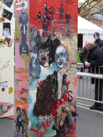 Am Vortag der Feiern zum Mauerfalljubiläum wagen wir uns ins Getümmel um das Brandenburger Tor. Die Atmosphäre ist noch internationaler als sonst, viele junge Leute aus aller Welt scheinen dieses Jubiläum mit uns feiern zu wollen. Das Brandenburger Tor ist abgesperrt, die über 600 Dominosteine, die zwischen dem Potsdamerplatz und dem Reichstag auf dem ehemaligen Grenzverlauf aufgestellt sind, müssen vor den friedlichen Massen geschützt werden. Nach einigen Umwegen kommen wir dann doch sehr nah an diese ca. 2 Meter hohen Dominosteine heran, die von Jugendlichen aus aller Welt bemalt wurden. Bei näherer Betrachtung zeigt sich, dass der Mauerfall von den Jugendlichen sehr fantasievoll nachvollzogen und vielfältigst gestaltet wurde.