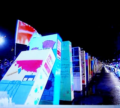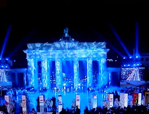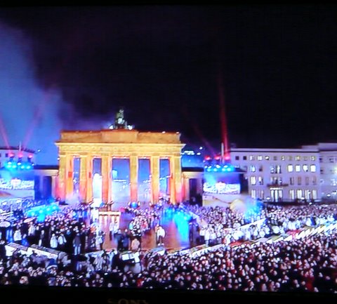 Am nächsten Tag öffnet der Himmel alle Schleusen, es regnet während der Feierlichkeiten am Brandenburger Tor, wie aus Kübeln. Die internationale Prominenz aus Politik und Wirtschaft ist gut beschirmt, das überwiegend junge Publikum lässt sich die Laune nicht verderben. Gordon Brown hält überraschenderweise die beste Rede, die altgewordenen Zeitzeugen reden ein bisschen zuviel. Thomas Gottschalk sorgt sich um seine Frisur und wirkt als ernsthafter Moderator fehl am Platz, dann fallen endlich die Dominosteine, wie damals die Mauer. Allgemeiner Jubel, manche sind bewegt, alle sind nass – das Feuerwerk versöhnt und das Brandenburger Tor, unser ewiges Symbol der Freiheit, ist in ein feiertägliches Blau getaucht.