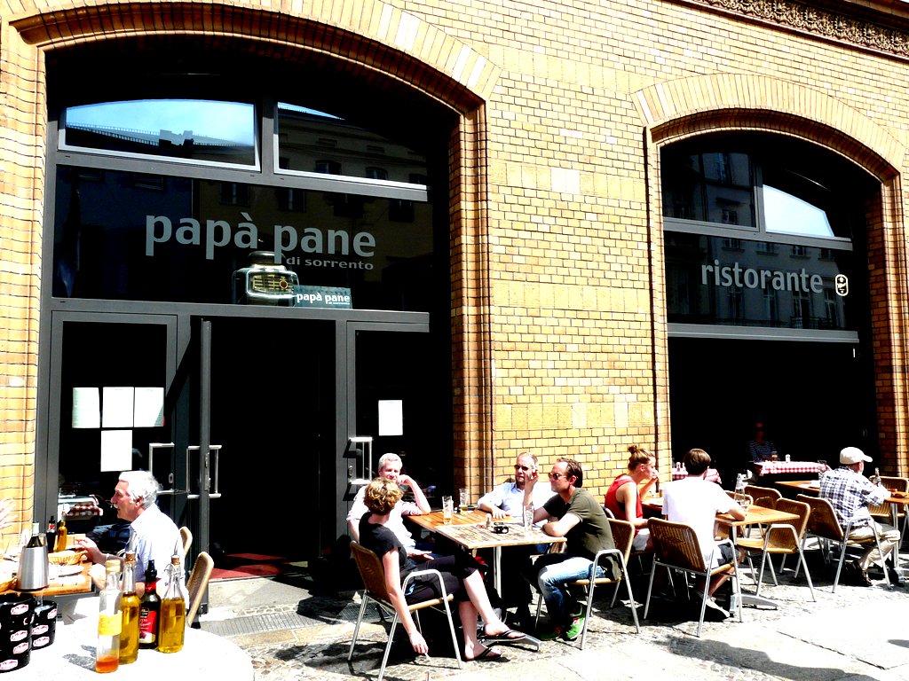 Wir biegen in die Ackerstr. 23 ein und finden dort den in der ganzen Gegend bekanntesten Italiener, das papa pane di sorrento. Hier ist an 7 Tagen der Woche ganztags immer was los. Das papa pane ist wegen des guten Essen und der vernünftigen Preise sehr beliebt bei Familien mit Kindern, entsprechend laut und fröhlich geht es zu. Die Pizza des Tages ist ein Gedicht und stillt den Hunger von zwei Personen.