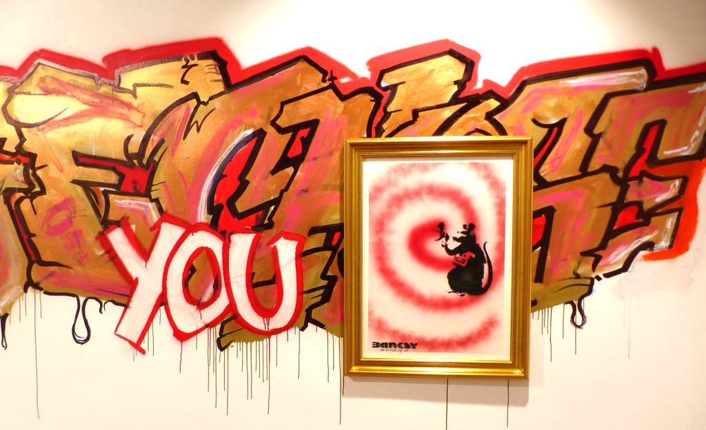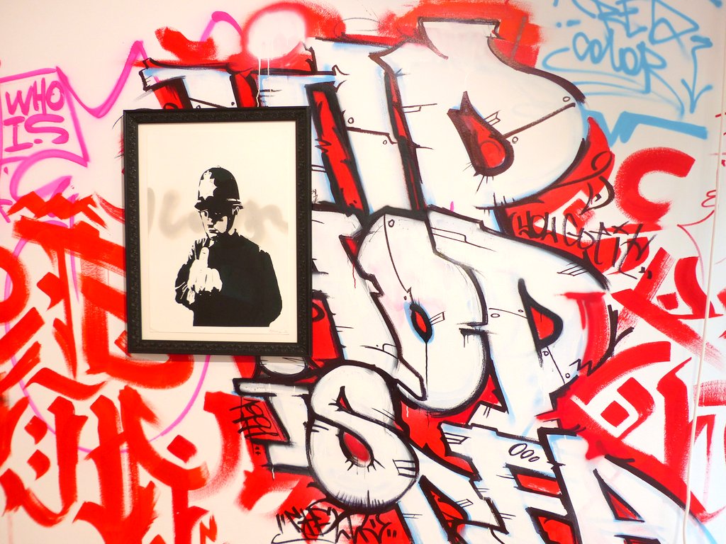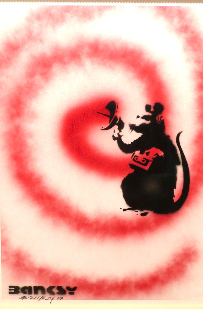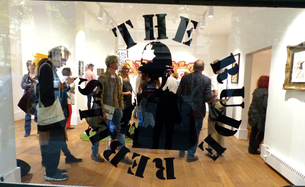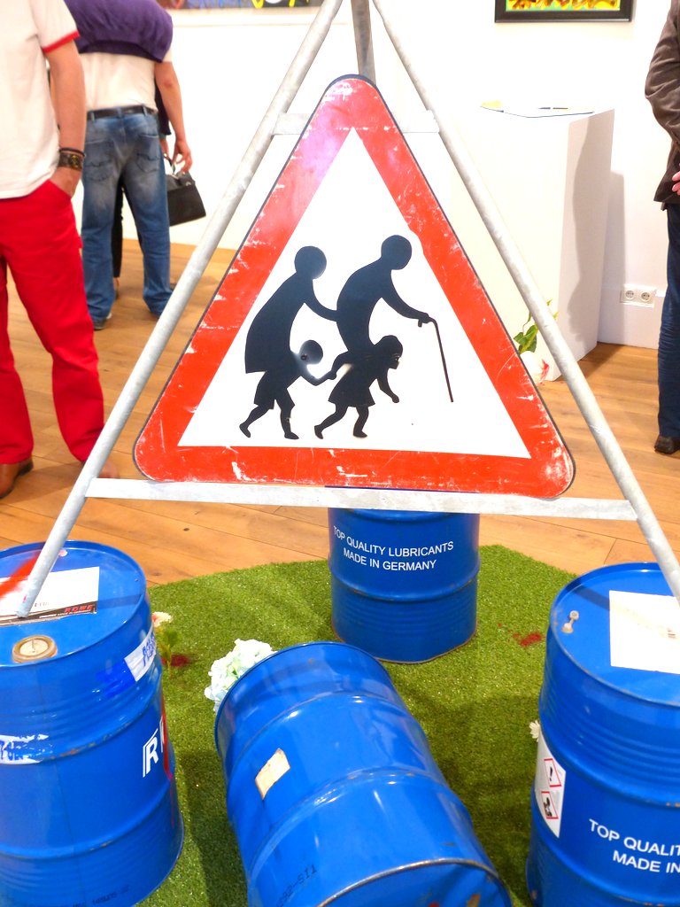 Neu war in diesem Jahr die Präsentation von „Streetart“ in einem Westberliner Hotel, unter dem Titel „THE RUDE REBELS -BANKSY & CO“. Die Ausstellung war dominiert von Arbeiten von Banksy, was der momentanen Hype um diesen genialen, immer noch anonymen Künstler geschuldet ist. Warum sich allerdings ausgerechnet dort, bei der Eröffnung, die inzwischen doch recht alt gewordene und ein bisschen