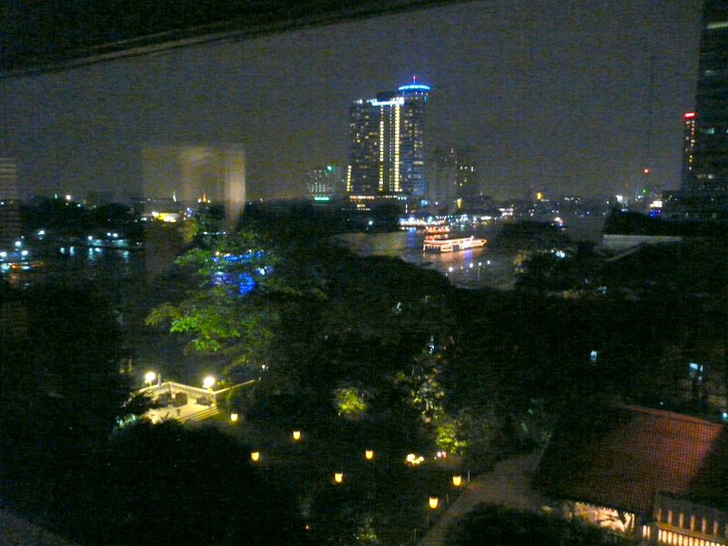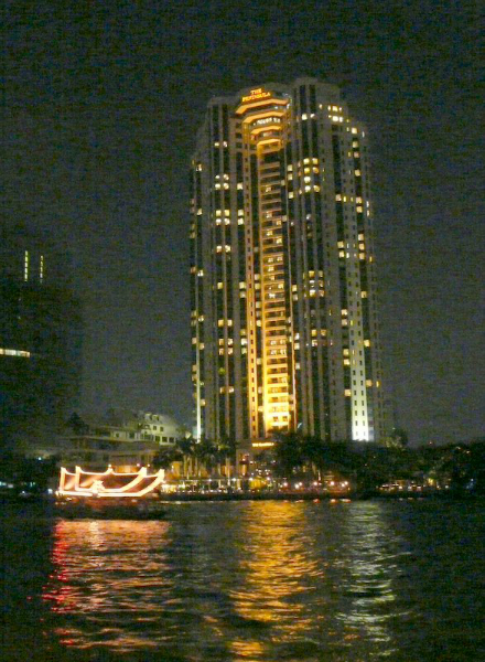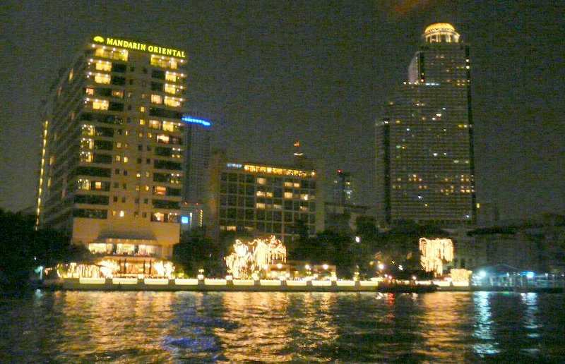 Am Flughafen erwartete uns ein livrierter Chauffeur des Hotels und fuhr uns mit einer Luxuslimousine, vorbei an einem Wald von Hochhäusern mit amerikanisch anmutenden Lichtreklamen, über ein Netz von sich unter- und überquerenden Autobahnen entspannt ins Stadtzentrum. Im Oriental wurden wir mit ausgesuchter Freundlichkeit empfangen und bezogen im 7. Stock unser geräumiges Zimmer mit atemberaubendem Blick auf die Umgebung und vor allem auf den Chao Phraya River, eine der wichtigsten Wasserstraßen der Stadt. Wir konnten uns an dem bunten Treiben mit exotischen Booten und Schiffen aller Art und Größen kaum satt sehen.