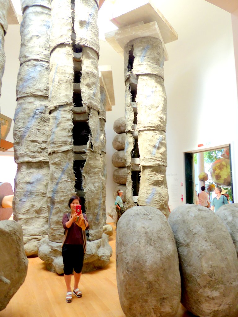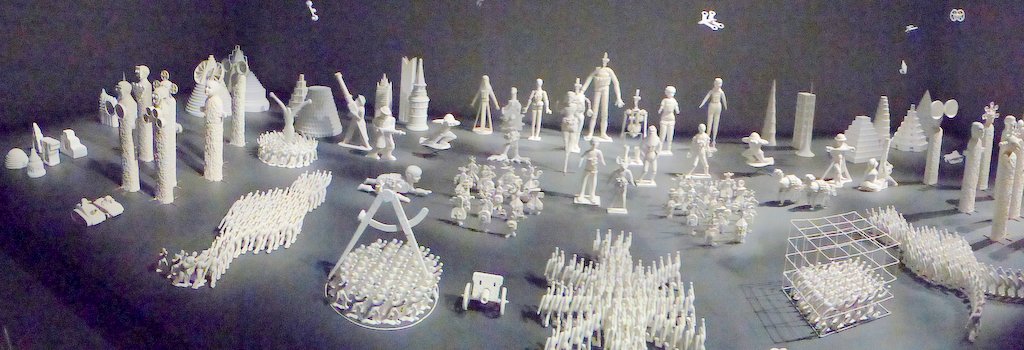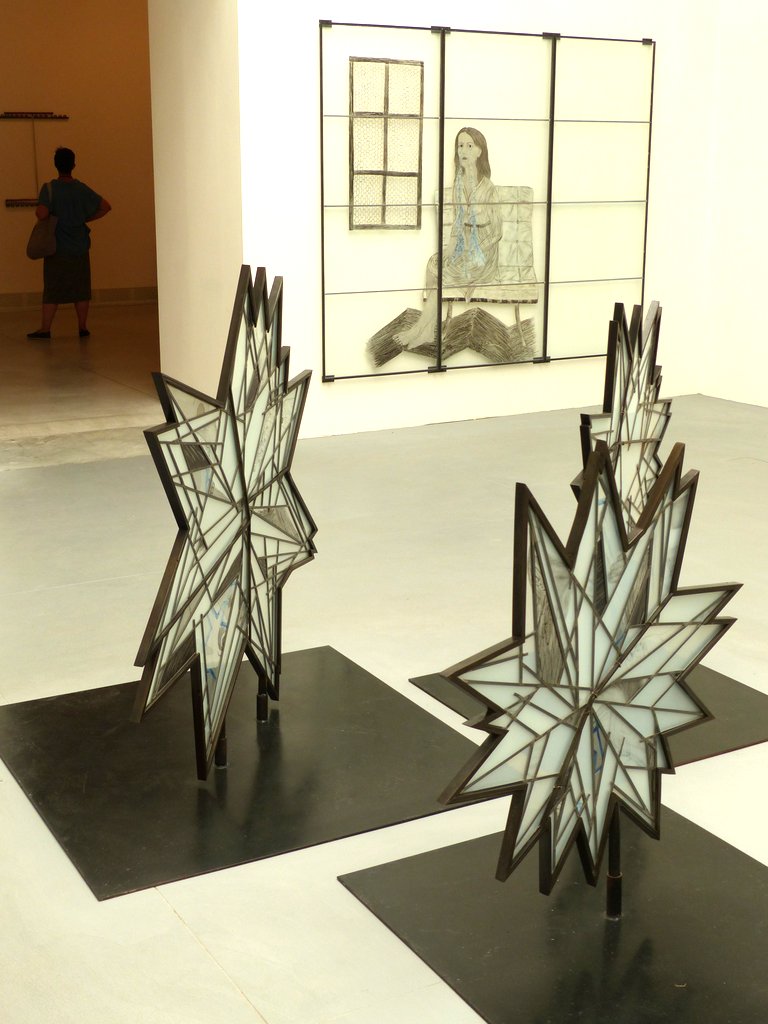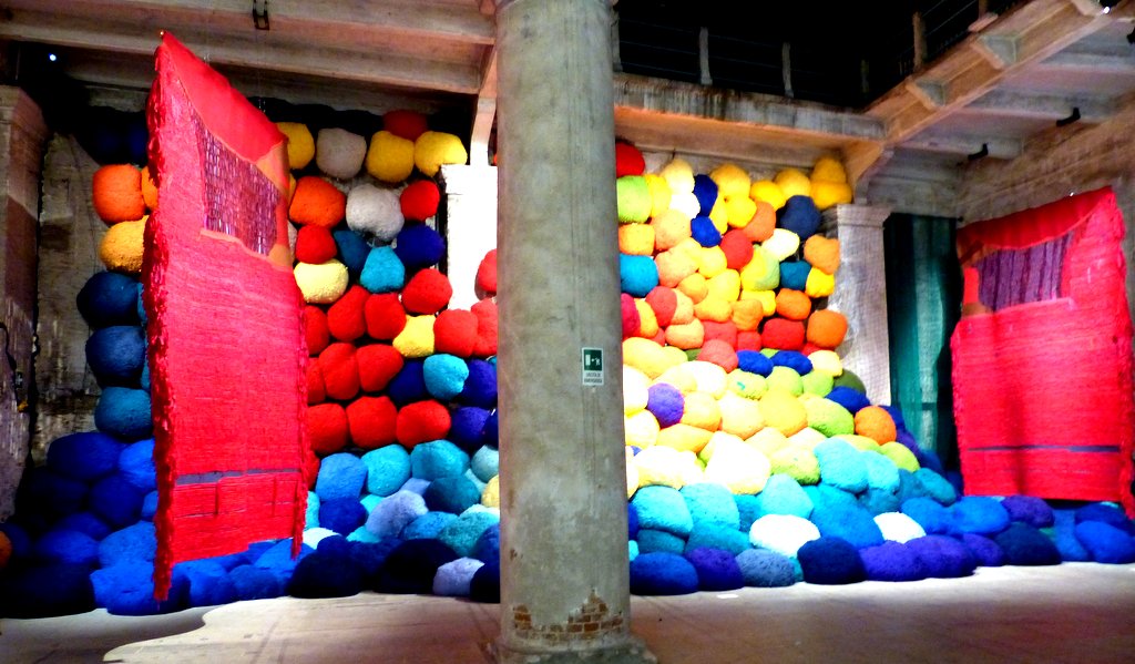 Marcel hat ihr Motto „Viva Arte Viva“ m.E. ziemlich konsequent umgesetzt. Man spürt ihre weibliche Handschrift (wie meine Barbara behauptet) und ein gewisses Streben nach kunstvoller Vielfalt und Harmonie. Letzteres ist mir persönlich bedeutend lieber, als eine „störrische“, z.B. von politischen Themen und dem Elend dieser Welt geprägten Biennale. Marcel hat die von ihr ausgewählten Künstler und Themen 9 s.g. Chaptern zugeordnet, die sich wie Kapitel in einem Buch ergänzen. Beginnend mit dem Pavillion der „Artists and Books“ folgen “Joys and Fears“ „Common“, „Earth“, „Traditions“, „Shamans“, „Dionysian“, „Colors“ und schließlich „Time and Infinity“.