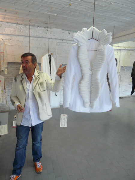 Zufällig entdecken wir bei unserem weiteren Bummel einen französischen Galeristen, der Bekleidung als Kunst präsentiert, d.h. diverse Künstler verwandeln banale Kleidungsstücke durch Verfremdung, Ausschmückung, Übermalung etc. in Kunstwerke aus teilweise „absurden“ Materialien. Das wäre doch eine tolle Idee für eine Ausstellung in exquisiten Kaufhäusern, wie z.B. bei meinen Freunden der Galeries Lafayette in Berlin.