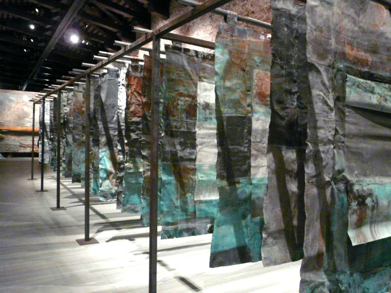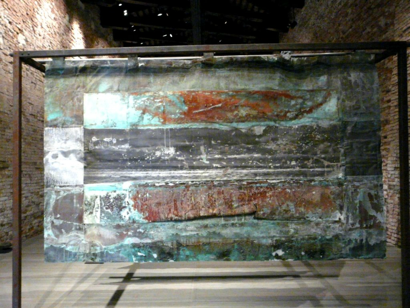 Wir bummeln durch schmale Gassen, über Brücken und durch malerische Hinterhöfe weiter Richtung Westen, lassen die berühmte Peggy Guggenheim Collection dieses Mal buchstäblich links liegen und stoßen wieder auf die Lagune. Fast zufällig stehen wir vor historischen, restaurierten Salzmagazinen, in denen ein Museum für den abstrakten italienischen Expressionisten Emilio Vedova untergebracht ist und Anselm Kiefer eine fantastische Ausstellungsmöglichkeit geboten wird. Unter dem Titel „Salt of the Earth“ werden in diesen historischen Gemäuern Gemälde und Skulpturen von Kiefer präsentiert, die zu den künstlerischen Höhepunkten unseres diesjährigen Venedig-Besuchs gehören.