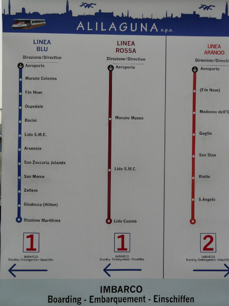 Alle 30 Minuten fährt ein Schiff der Blue Line von den Haltestellen Zattere, San Marco etc. in einer ca. 90 minütigen, spektakulären Fahrt vorbei am Lido und Murano zum Flughafen und zurück. Die Fahrt kostet 12.-€ und bietet wunderbare Aus- und Einblicke auf dieses Gesamtkunstwerk Venedig – zur Einstimmung bei der Ankunft oder stimmungsvolles Abschiedsgeschenk.