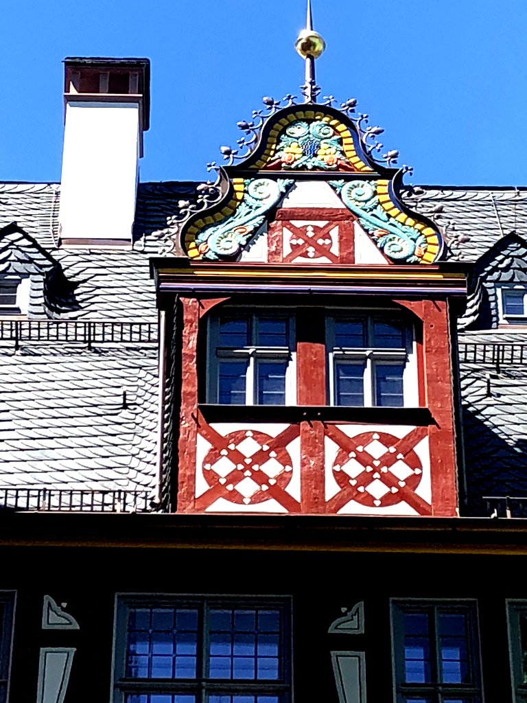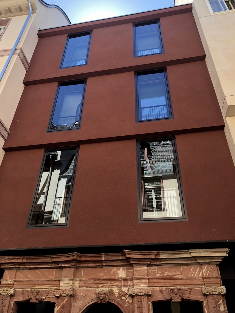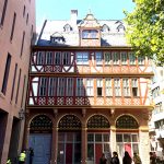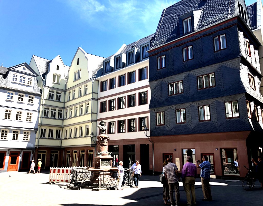 Unter fachkundiger Führung bummelten wir durch dieses spektakuläre, „alte“ Stadtviertel, das liebevoll und qualitätsbewusst im historischen Stil  völlig neu geplant und wieder aufgebaut wurde. Der Wiederaufbau nach der totalen Zerstörung durch die Luftangriffe 1944 in den Nachkriegsjahrzehnten war geprägt vom damals modernen „Betonbrutalismus“. Offenbar setzte sich aber in der Folge bei den Bürgern und den Entscheidungsträgern die Sehnsucht nach der alten, heimeligen Frankfurter Altstadt durch. Folgerichtig wurden die Nachkriegsbauten nach über 60 Jahren wieder abgerissen und machten den jetzigen, „historischen“  Neubauten Platz. Die neuen, spitzgiebeligen Gebäude Strassenzüge und Plätze zeichnen sich durch eine Farben-, Formen- und Materialvielfalt aus, die dem Besucher zeigt, hier wurde nicht gespart, sondern liebe- und geschmackvoll „geklotzt“!
