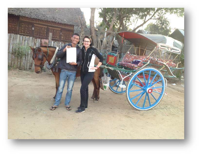 Der nachfolgende Reisebericht stammt von Ulrike Aichhorn, die wir bei unserer letzten Burmareise zufällig beim Strandurlaub kennenlernten. Sie überraschte uns damals zunächst mit ihrem sozialen Engagement für eine Schule bei Mandalay. Damit nicht genug, erzählte sie uns von ihrer Idee, dem liebenswürdigen Fahrer eines Pferdewagens, der sie in Bagan touristisch begleitet hatte, ein besonderes Geschenk zu machen. Ihr Wunsch war es, Naing Naing über Spenden seinen eigenen Pferdewagen zu finanzieren und ihm somit ein Leben als selbständiger Unternehmer zu ermöglichen. Gesagt, getan – Ulrike sammelte im Freundes- und Bekanntenkreis die benötigte Summe und übergab sie persönlich am 19.12.2013 in Bagan an den überglücklichen Naing Naing.