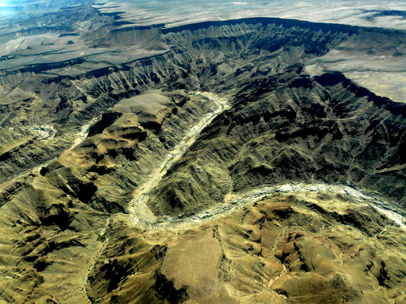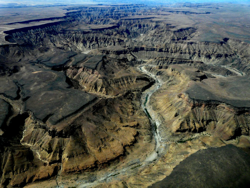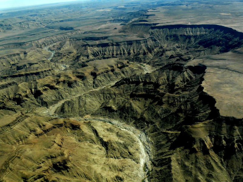 Die Flugroute führt an den Auas- und Schwarzrandbergen vorbei, wir schauen dem Brukkaros-Vulkan in seinen erloschenen Schlund, erahnen in der Ferne die Kalahariwüste und staunen über die vielen ausgetrockneten Flussbette, die die Landschaft geprägt und gestaltet haben. In großen Abständen überfliegen wir einsame Farmen, die über riesiges Land verfügen, an momentan weitgehend ausgetrockneten Flussläufen angesiedelt sind und dringend auf Regen warten. Der Regen ist im Süden in diesem Jahr schon um 2 Monate überfällig. Die Farmen betreiben Viehzucht, wobei man sich von oben kaum vorstellen kann, wo die Herden in der Trockenzeit genügend Futter und Wasser finden sollen. Das Land hat nur wenige geteerte Strassen, die sich allerdings wie vom Lineal gezogen über Hunderte von Kilometern schnurgerade durchs Land ziehen. Ansonsten sind die Farmen nur über Schotter- und Sandpisten erreichbar.