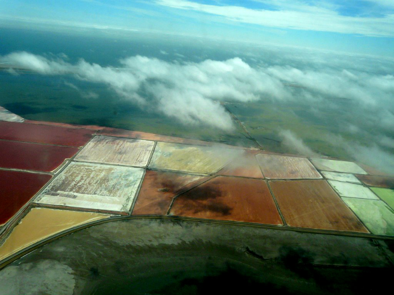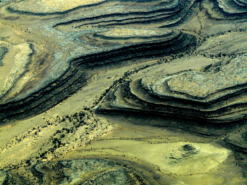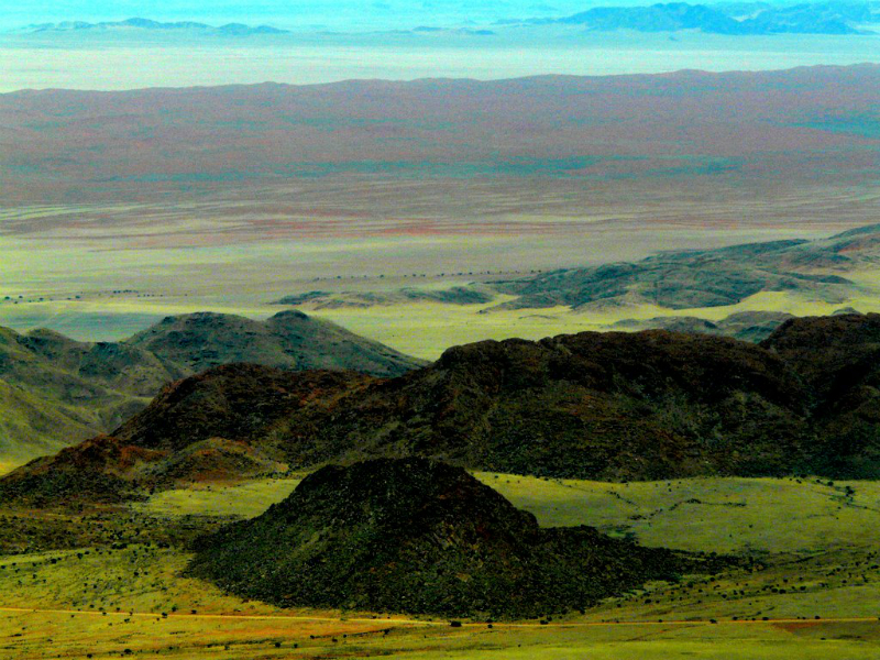 Der Flug geht zunächst über hügeliges, recht grünes Savannenland, dann ändert sich die Landschaft, wird zur Halbwüste und schließlich zur sonnenverbrannten Wüste. Die Farben sind zunächst noch nicht sehr spektakulär, Beige- und Brauntöne überwiegen, die Außentemperatur zeigt in 1000 m Höhe 15 Grad an.