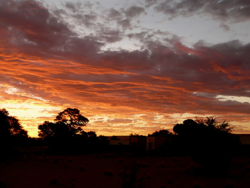 Glücklicherweise hatte der afrikanische Veranstalter „Sense of Africa“ zufällig ein Transferauto in der Nähe, dessen Fahrerin unseren Piloten und uns dann in einer vierstündigen Fahrt zurück nach Windhoek brachte. Die Fahrt über 400 km auf einer kerzengeraden Straße mit „maximal 5 Kurven“ war zwar interessant, zumal der gewitterträchtige afrikanische Abendhimmel uns noch einmal mit dramatischem Farbenspiel verwöhnte. Aber leider kamen wir erst spät abends im Hotel an und verloren auf diese Weise nochmals einen halben Tag.