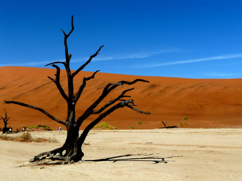 Für normale Pkw ist hier Schluss, wir pflügen mit unserem Vierrad weiter in Richtung Deadvlei, einem weiteren visuellen Höhepunkt. Bei nunmehr sicher schon 40 Grad laufen wir ca. 1,5 km in ein „Tal des Todes“. Vor vielen 100 Jahren wurde ein Tal durch Sanddünen so eingeschlossen, dass kein Wasserzufluss mehr möglich war und die riesigen Kameldornbäume langsam abstarben. Dieser Baumfriedhof erinnert uns stark an surrealistische Bilder von Dali, in denen er eine grenzenlose Einsamkeit und Verlorenheit darstellt – die schwarzen Baumskelette auf weißem Untergrund umgeben von roten Dünen und das alles in einer flirrenden Hitze – unvergesslich! Unser Führer macht uns klar, dass wir ohne Wasser hier in kürzester Zeit verloren wären.
