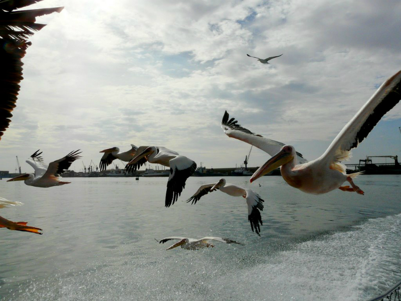 Anschließend erfolgte der Angriff der „namibischen Luftwaffe“ in Form eines Pelikanschwarms, der das Schiff auf Armlänge begleitete, um sich ebenfalls seine Fischration abzuholen. Der Arm des Kapitäns verschwand bis zum Anschlag n den Schnäbeln – es wurde sozusagen in der Luft aufgetankt!