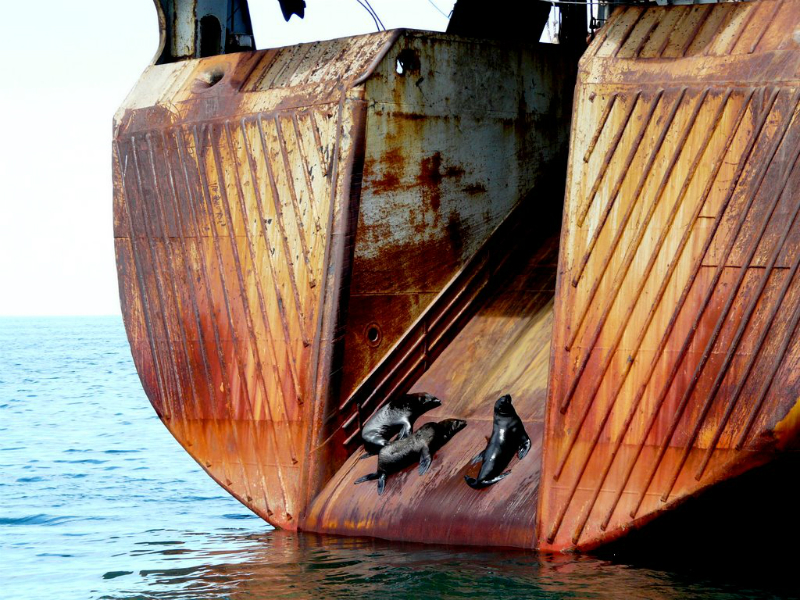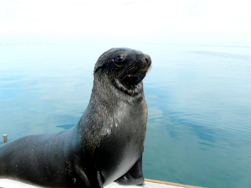 Die Bootsfahrt beginnt für mich mit einem feuchten, kalten Robbenkuss hinters Ohr – während ich es mir gemütlich machen wollte, sprang, von mir unbemerkt, hinter mir eine Robbe aufs Boot, nahm Kurs auf mich und gab bei mir auf diese Weise ihre „Fischbestellung“ auf. Nach dem ersten Schreck schlossen wir schnell Freundschaft – zumal wir vom Kapitän erfuhren, dass die wilden Robben sich im Laufe der Zeit ihre Schiffe ausgesucht haben, die sie immer wieder besuchen, in Erwartung von leckerem Fisch. Diesem Wunsch kam der Kapitän dann auch ausgiebig nach.