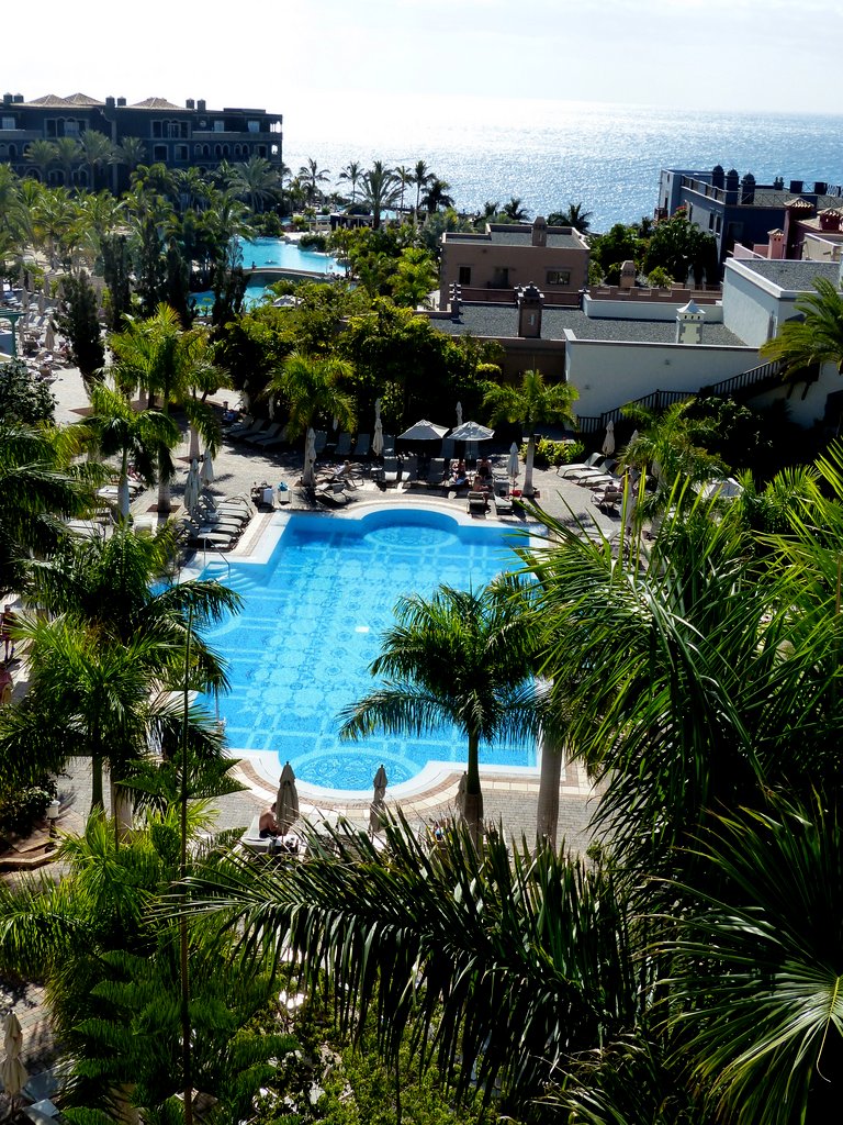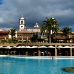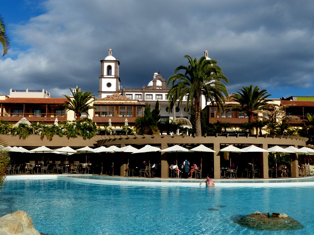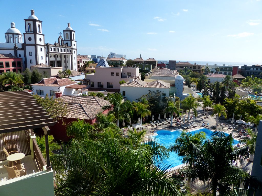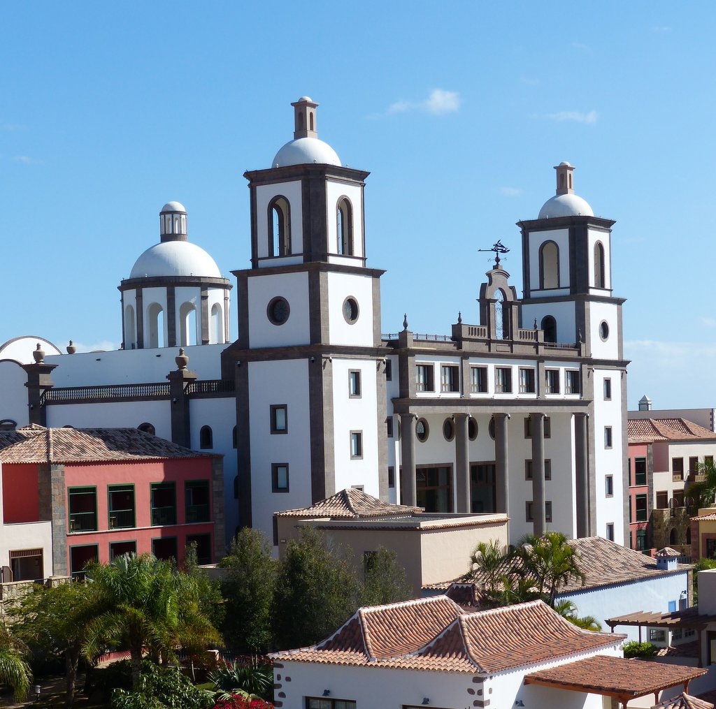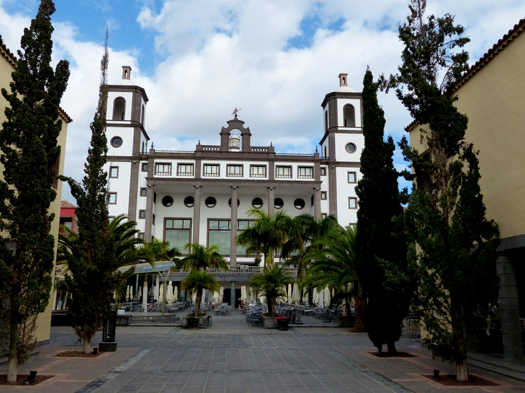 Nach einer ca. halbstündigen Autobahnfahrt mit dem Mietwagen vom Flughafen nach Meloneras standen wir in dem einer kanarischen Kirche nachgebauten prachtvollen Empfangsgebäude des Resorts, das uns mit seinen Säulen und immensen Dimensionen zunächst fast etwas einschüchterte. Es stellte sich heraus, dass wir in keinem klassischen Hotel untergebracht waren, sondern in einer weitläufigen, dezentralen Urlaubsanlage, die einem kleinen kanarisches Dorf nachempfunden wurde und sich terrassenförmig  vom Hauptgebäude zum Meer hin erstreckte.