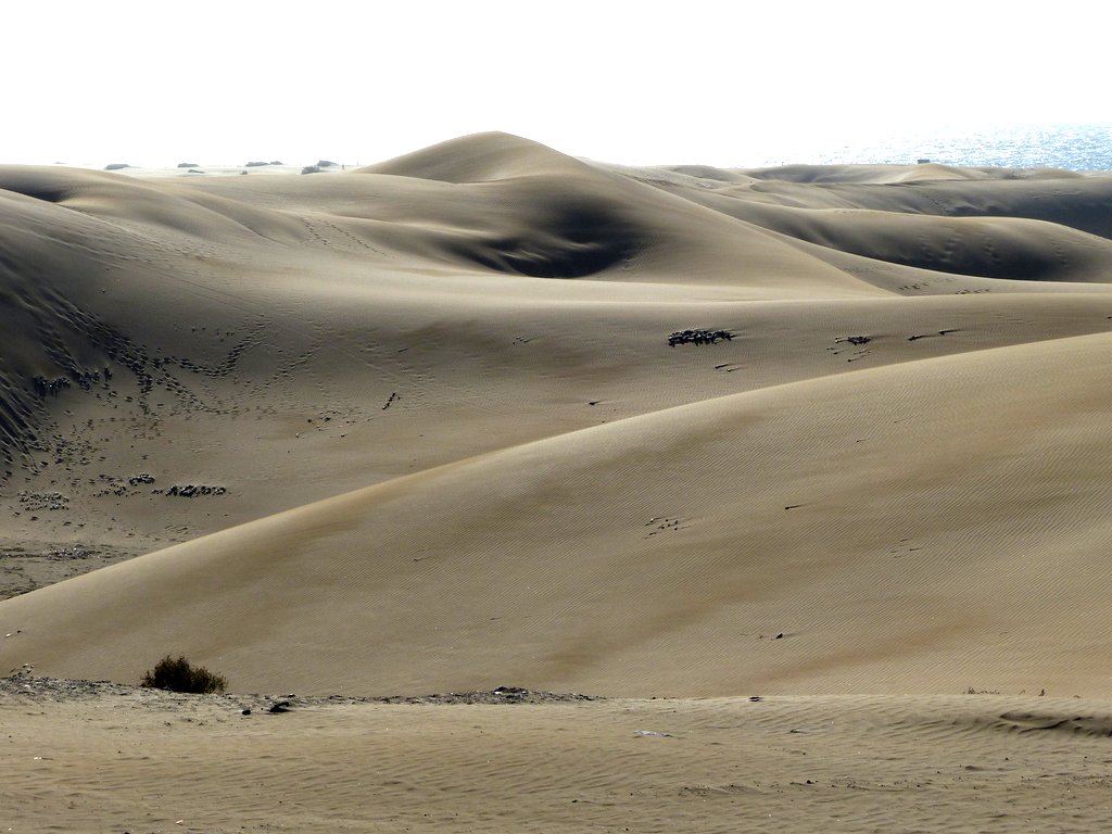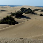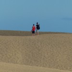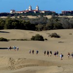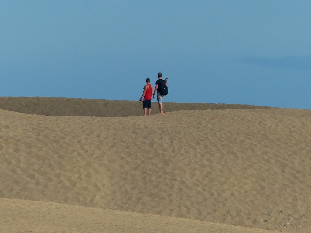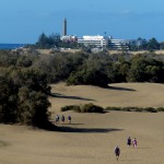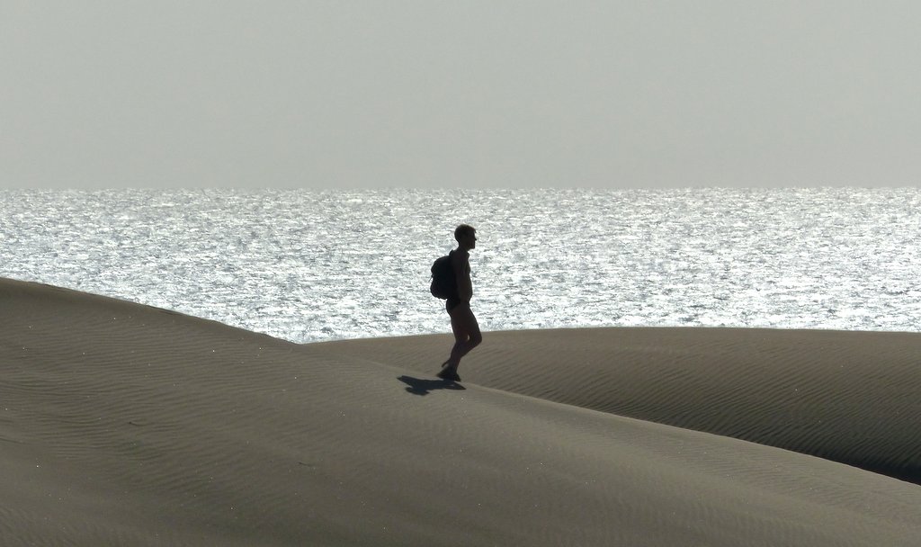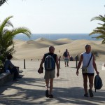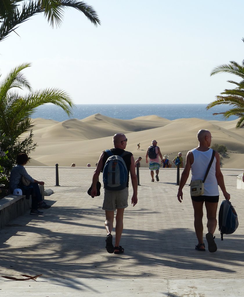 Wir ließen uns natürlich den Besuch der berühmten Dünen von Maspalomas nicht entgehen. Obwohl wir auf eine ausgiebige Dünenwanderung verzichteten, waren die Ausblicke von verschiedenen Standorten aus auf diese ausgedehnte Dünenlandschaft, das Spiel von Wind und Wetter, die sich verändernden Farben und Formen je nach Lichteinfall, den Kontrast des Meeres, der hohen, weiß / beigen Dünen vor dunklen, wolkenverhangenen Bergen im Hintergrund – wunderbar und unvergesslich. Die Tatsache, dass die männlichen, gleichgeschlechtlichen Paare an und in den Dünen durchaus in der Mehrheit waren, gab dem ganzen Szenario seine besondere Note.