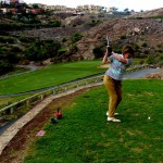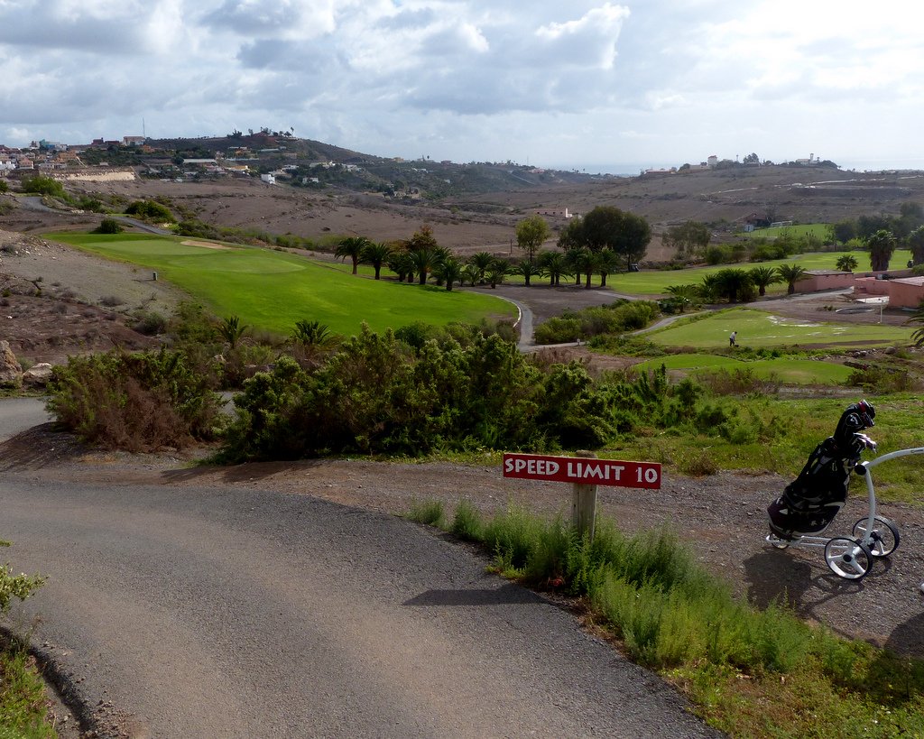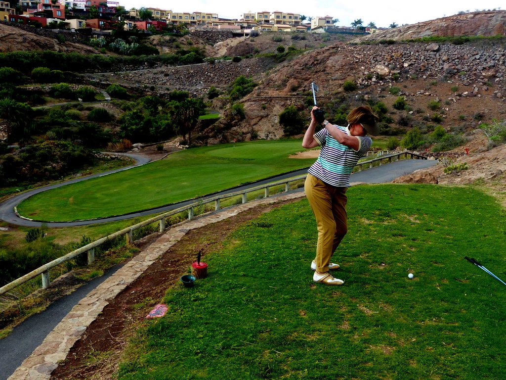 Im Sheratonhotel stellten wir unseren Mietwagen ab und übernahmen ein Golfcart, das uns zum deutlich höher gelegenen Abschlag 1 des Salobre Süd brachte. Eine Golfrunde in spektakulärer Umgebung lag vor uns, es ging auf und ab, die Ausblicke auf Berge, Schluchten und Meer entschädigen für den einen oder anderen Fehlschlag. Enge, aber faire Spielbahnen erforderten ein präzises Spiel, zumal Schluchten und ziemliche Höhenunterschiede zu bewältigen waren. Letztendlich spielten wir auf dem Par 71 Platz  eine ordentliche Runde, wobei die enormen Höhenunterschiede es unbedingt ratsam machten, ein Golfcart zu nehmen.