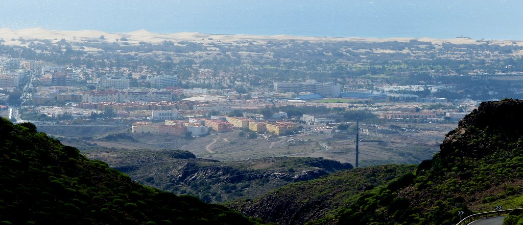 Bei der Rückfahrt gab es noch mehrfach die Gelegenheit, den Blick auf das bergige Hinterland von Maspalomas und die in der Ferne hell glitzernden Dünen vor dem tief blauen Meer, in Verbindung mit tollen Wolkengebilden  zu genießen.