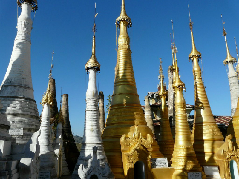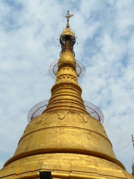 Natürlich durften auch Pagoden-, Tempel und Klosterbesuch nicht fehlen, z.B. das Kloster „mit den springenden Katzen“, die für Futter durch Reifen sprangen. Alle fanden das süß, ich weniger, da man mit nackten Füssen in stinkender Katzenpisse standt – aber vielleicht besitzt diese heilige Flüssigkeit ja Heilkraft? Der Besuch der Phaung Daw U Pagode, der „königlichen Barke“ , gehörte auch zum Pflichtprogramm, 5 kleine Buddhas wurden dort von den Gläubigen mit ihren Goldplättchen zu unförmigen Goldklumpen gemästet, als Dank für ein Wunder im 12. Jahrhundert.
