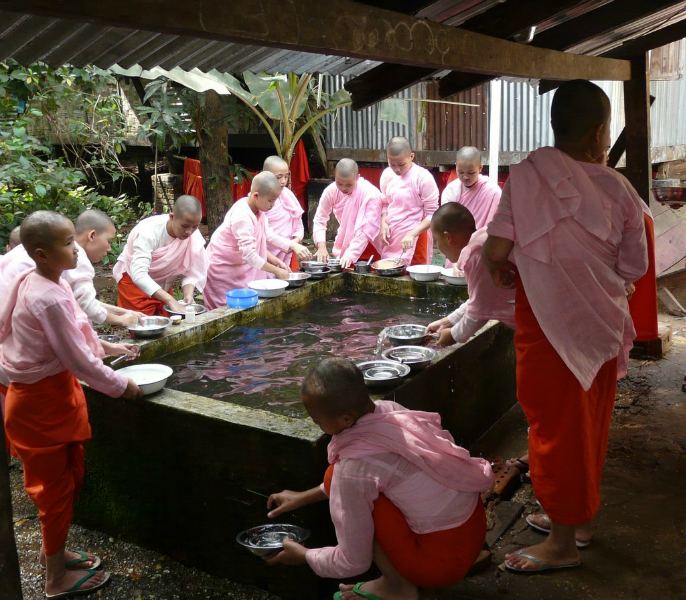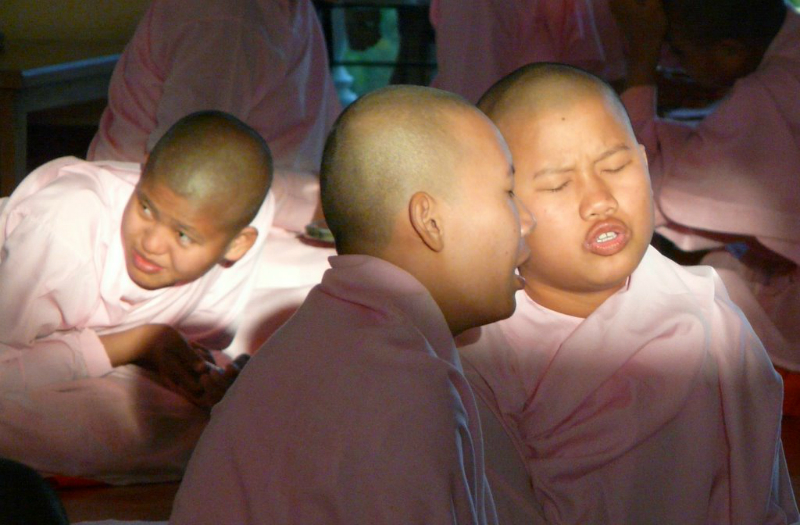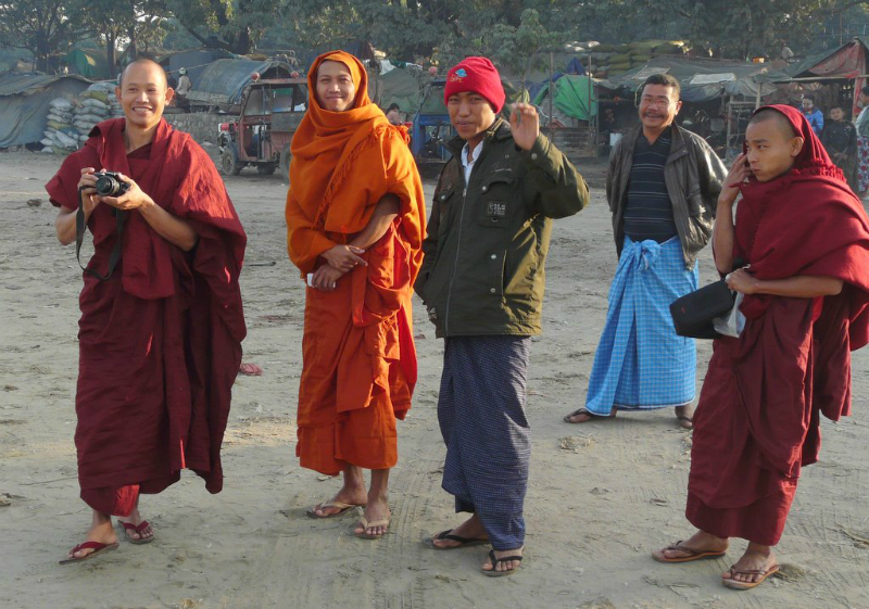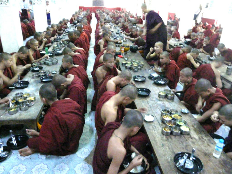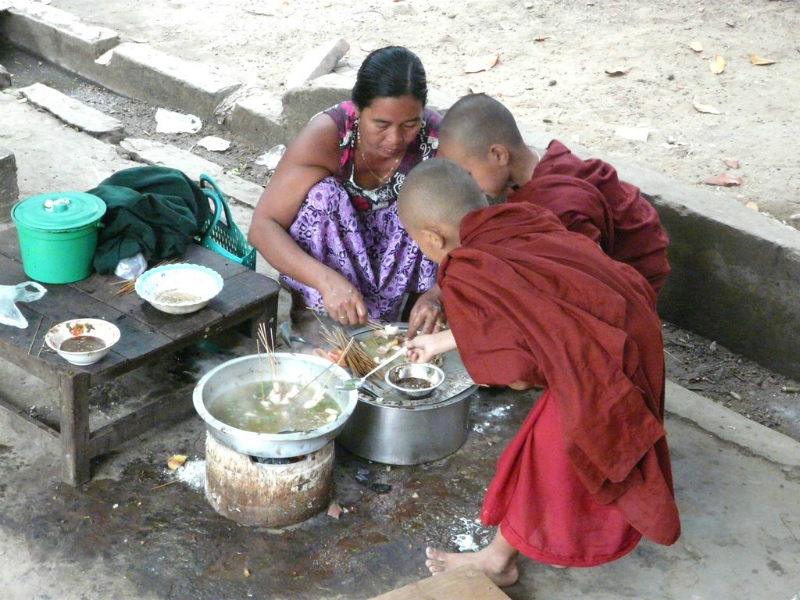 Dieser Eindruck wurde verstärkt durch den Besuch eines alten Männer- und Frauenklosters am Rand der Stadt. Wir konnten am täglichen Leben der Mönche teilnehmen, sie ließen sich durch uns in keiner Weise stören. Jeder männliche Burmese muss einmal als Mönch gelebt haben, den Zeitpunkt und die Zeitdauer bestimmt er selbst. Die Mönche leben in Armut und Keuschheit und müssen sich jeden Tag ihre Nahrung selbst erbetteln. Insofern sah man im Straßenbild des ganzen Landes eine Vielzahl von kahl geschorenen Mönchen in ihren roten Kutten, deren mitgeführte Gefäße von der Bevölkerung ohne besondere Aufforderung gefüllt wurden. Es gehört für jeden Burmesen zur selbstverständlichen Pflicht, dass man die Mönche mit Lebensmittel und Geld unterstützt. Im ganzen Land gibt es bei einer Bevölkerung von 60 Millionen immerhin ca. 600.000 Mönche, die tagtäglich versorgt werden müssen. Im Kloster konnten wir dann das normale Leben der Mönche verfolgen – es herrschte eine entspannte, fast fröhliche Atmosphäre aus Arbeit, gemeinsamem Essen, Gesängen und Meditation und für die Kleinen auch einer Schule. Im benachbarten Frauenkloster geht es ähnlich zu, nur dass die Nonnen in rosa Kutten gekleidet sind und alles noch ein bisschen ordentlicher als bei den Männern wirkt.