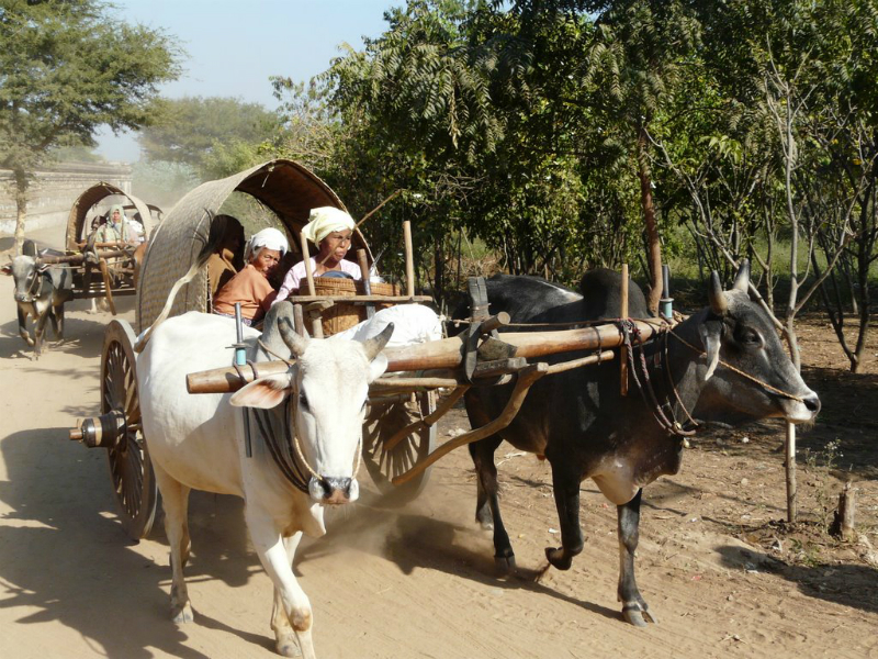 Wir starteten unsere Besichtigungstour vorbei an einer Vielzahl von Pagodenruinen und Gespannen von Ochsenkarren und tauchten sofort in eine fremde, reizvolle Welt ein. Unser erstes Ziel war der Anandatempel, einer der ältesten, schönsten und meist verehrten Tempel Bagans.