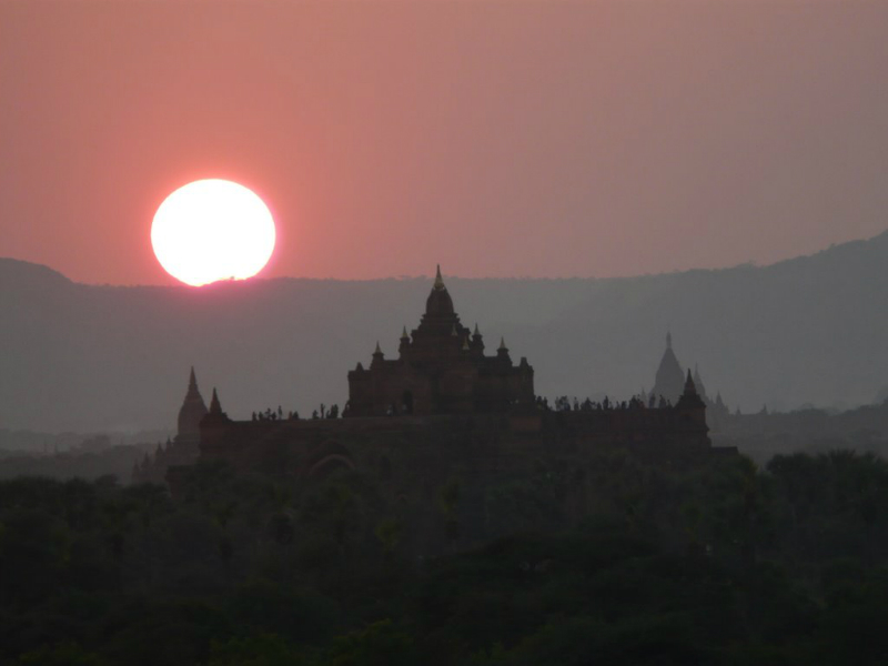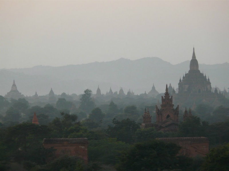 Danach bereiteten wir uns langsam auf einen der großen Momente der ganzen Reise vor – den Sonnenuntergang in mitten der Pagodenfelder. Wir bestiegen die Plattform einer größeren Pagode und beobachteten von dort, wie sich Hunderte von Pagoden und Tempel im Farben- und Schattenspiel der untergehenden Sonne ständig veränderten. In der weiten Ebene stieg leichter Nebel auf und verwandelte das Ganze in eine unwirkliche, mystische Traumlandschaft, die sicher zu den unvergesslichen und magischen Momenten eines jeden Weltenbummlers zählt.