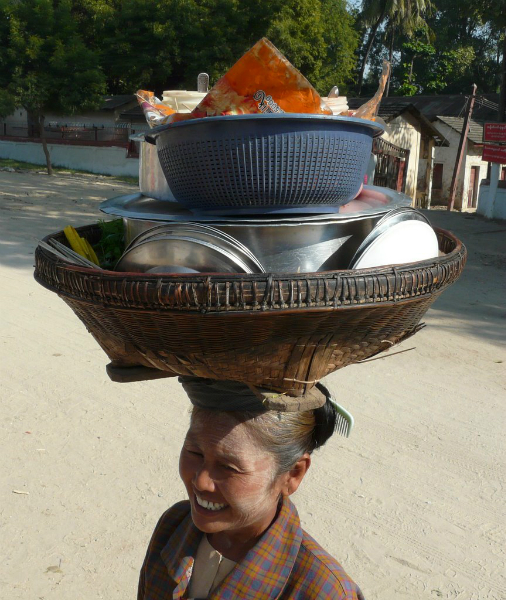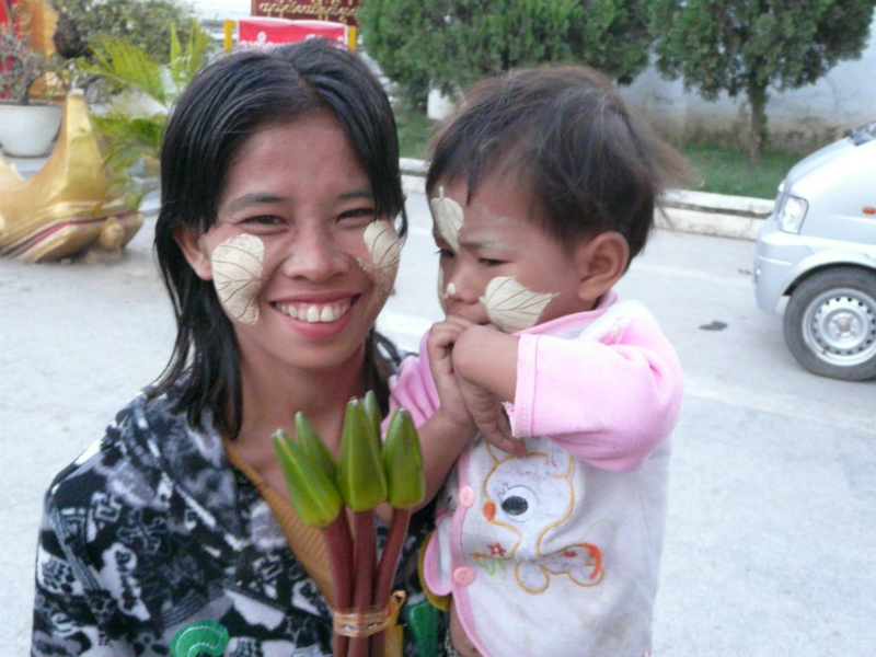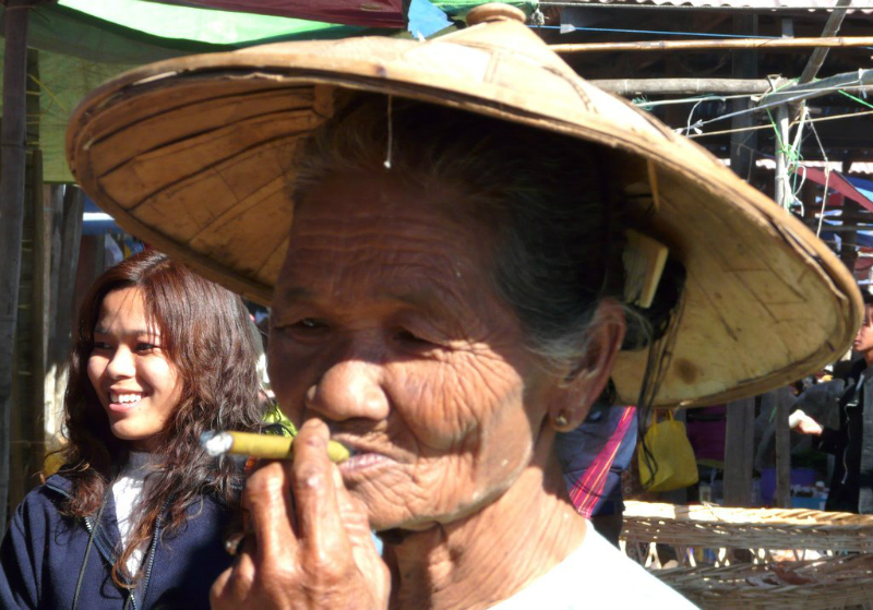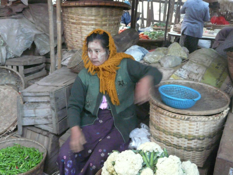 Frauen in den malerischen Trachten der verschiedenen Volksstämme sitzen mitten in ihrem Gemüse-, Gewürze-, Blumen- oder auch Fisch- und Fleischangebot, es wird geprüft, gehandelt oder auch nur „geschwätzt“, die wenigen Touristen werden mit ihren Fotoapparaten freundlich geduldet. Neben dem Nahrungsmittelangebot bieten diese Märkte natürlich auch Kunstgewerbe, Textilien; Gegenstände des täglichen Bedarfs und nicht zuletzt auch Medikamente an. Da es in Burma keine Krankenversicherung gibt, ist das ein Weg, um zu einigermaßen preiswerter Medizin zu kommen – Selbstmedikation ist gefragt! Neben den Trachten sind es vor allem die Gesichter, die in Erinnerung bleiben – das freundliche Lächeln überall, die großen fragenden Kinderaugen, das zerknitterte Gesicht alter Bäuerinnen, die dicke Zigarren rauchen oder Bethel kauen…