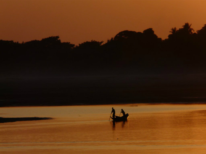 Der breite Fluss hatte überraschenderweise kaum Verkehr, abgesehen von Holztransportern und Flößen aus Bambus, auf denen die Besatzungen in kleinen Hütten lebten. Das Schiff musste immer wieder vorsichtig großen Sandbänken ausweichen und erlaubte schöne, aber leider nur flüchtige Aus- und Einblicke, darüber, was sich in den Fischerdörfern, in der Landwirtschaft und in den kleinen Häfen am Ufer tat. Gegen Abend ankerten wir in der Flussmitte, der Sonnenuntergang erzeugte erneut eine andächtige Stimmung. Sie wurde dann allerdings von der angekündigten Überraschung am späten Abend noch getoppt: