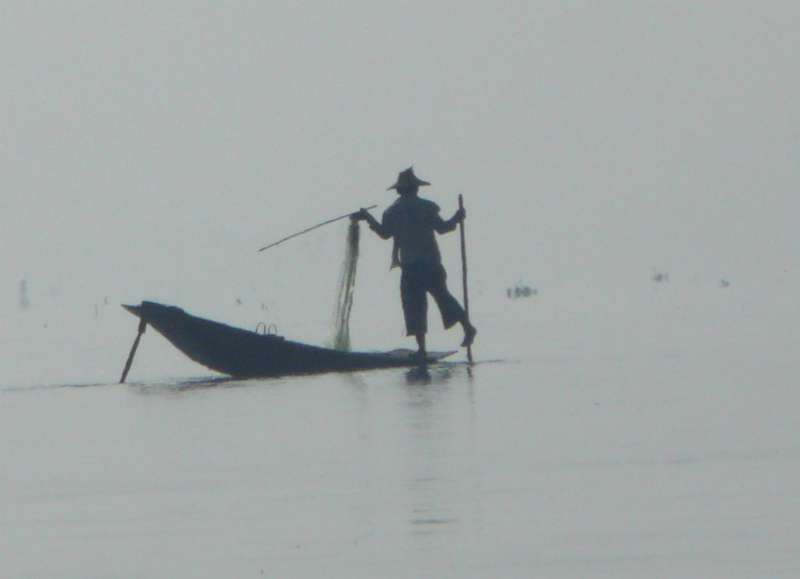 Am Mittag begannen per Boot unsere Erkundungen und Besichtigungen dieser wunderbaren Seenlandschaft. Auf dem See war um diese Tageszeit relativ wenig los, umso mehr fielen die weltberühmten Einbeinruderer der Inthas auf. Die Fischer haben diese einzigartige Rudertechnik entwickelt, um beide Hände frei zu haben für den Fischfang mit einem konisch geformten Bambuskorb mit Netz. Sie stochern