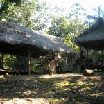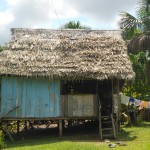 Am nächsten Tag genießen wir eine 3-stündige Fahrt auf dem Rio Nanay, einem Nebenarm des Amazonas‘ bis wir schließlich das Dschungeldorf „Gen Gen“ erreichen. Hier wohnen Davids Großeltern, die uns erst einmal zu einem Mittagessen einladen. Hier direkt im Dschungel ist es noch heißer und man hat beinah das Gefühl, sich in einem Tropenhaus zu befinden. Zu essen gibt es Reis mit Hühnchenfleisch und gebackenen Bananen, ein für Peru typisches Gericht. Plötzlich rennen ein paar aufgeschreckte Hühner vor dem Haus entlang. Ich gucke auf mein Essen und denke „das nenne ich Biohühner“. Nachdem wir gestärkt sind und unsere Gummistiefel angezogen haben, geht es auch direkt los in den Dschungel. Begleitet werden wir von einem Pferd, das unsere Lasten trägt, einem 70-jährigen Einheimischen mit Spitznamen „Abelito“, der erschreckenderweise schneller zu Fuß ist als wir, und einem weiteren Einwohner Gen Gens. Nach einem ca. 3-stündigen Marsch durch das Dickicht des Dschungels, vorbei an Bananenbäumen, wild wachsenden Ananas, Gummibäumen und einigen Affen, kommen wir völlig erschöpft in Davids selbstgebautem Dschungelcamp an. Nachdem die Hängematten für die Nacht aufgehängt sind, wird auch sogleich das Abendessen zubereitet. Es gibt für jeden einen halben Fisch mit Gemüse gefüllt, den wir in ein Bananenblatt einhüllen und über dem offenen Feuer garen. Zu meiner Überraschung ist dieses Dschungelmahl ein äußerst köstliches. Todmüde geht es danach in die Hängematten, die doch bequemer sind, als gedacht.