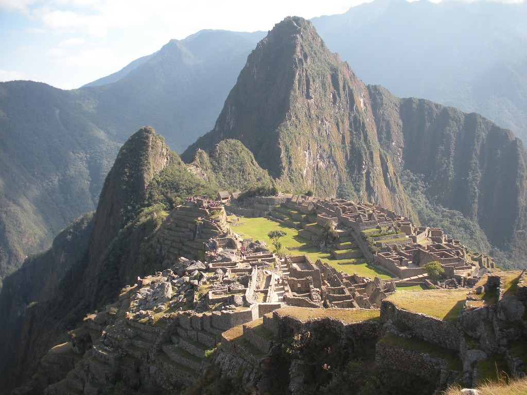 Am nächsten Tag geht es weiter mit dem Zug nach Aguas Calientes, dem Dorf am Fuße des Machu Picchu. Hier gibt es keine Autos und alles ist auf den Tourismus abgestimmt. Lange möchte man sich hier nicht aufhalten und alle haben sowieso das gleiche Ziel: Die Ruinen von Machu Picchu, der alten Inkastadt. Tickets für das UNESCO-Welterbe erwirbt man am besten vorher in der Touristeninformation sowie ein Busticket, sofern man nicht hinauf wandern möchte. Am nächsten Morgen stehen wir um 4.00Uhr auf, um den ersten Bus um 4.30Uhr hoch zu den Ruinen zu nehmen. Natürlich sind wir nicht die einzigen Touristen, die sich den Sonnenaufgang dort oben nicht entgehen lassen wollen. Oben angekommen bietet sich uns ein magischer Blick auf die noch verschlafen wirkende und vom Sonnenlicht noch nicht erreichte alte Stätte der Inka, von der man bis heute nicht weiß, wozu sie diente. Als erstes erklimmen wir ein Stück des Berges, um eine bessere Sicht zu haben, wenn die Sonne über die Bergkette kommt und die Ruinen in ihr Licht taucht. Die nächsten Stunden streifen wir durch die Ruinen und stellen uns vor, wie die Menschen hier früher gelebt haben. Den Abstieg bewältigen wir zu Fuß.