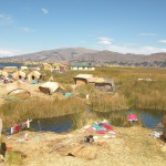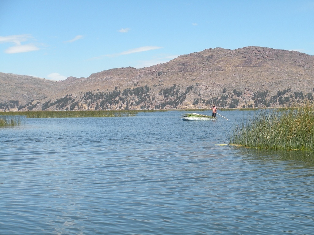 Erholt machen wir uns am nächsten Morgen auf, um die Islas de los Uros, die schwimmenden Inseln des Titicacasees zu besuchen. Der See liegt auf einer Höhe von 3812 Metern und ist das höchstgelegene kommerziell schiffbare Gewässer der Erde. Die Grenze zwischen Bolivien und Peru verläuft inmitten des Sees. Die Islas Flotantes bestehen aus kreuzweise aufgebrachten Lagen von Totora-Schilf, welches die Bewohner der Inseln immer wieder aus etlichen Kilometern Entfernung heranholen müssen. Das Schilf wird in regelmäßigen Abständen neu aufgelegt, damit die Inseln nicht im See versinken. Auch die Hütten und Boote bestehen aus Schilf. Als ein paar Wellen kommen bemerken wir, wie sich die Inseln unter uns ein wenig bewegen. Eine Bewohnerin gibt uns weitere Informationen über das Leben auf einer solchen Insel. Zum Abschluss unseres Ausfluges machen wir eine Fahrt auf einem der Schilfboote, welches die Einheimischen „Mercedes“ nennen. Wir werden zu einer anderen Insel gefahren, auf der sich eine Bar befindet. Hier werden die im Titicacasee gezüchteten Forellen frisch zubereitet.