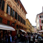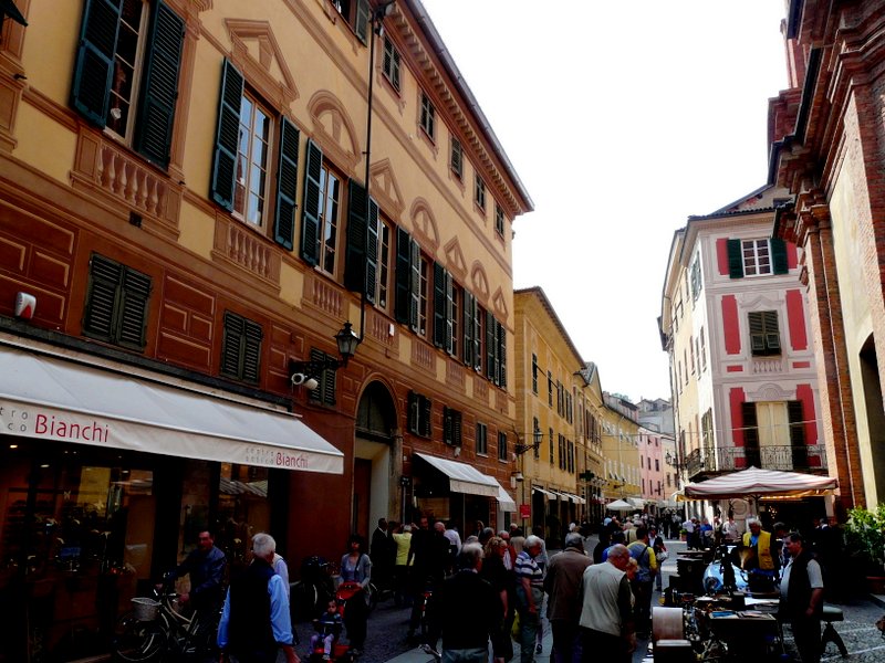Wie schon der Name sagt, ist der ligurische Einfluss in Novi besonders stark, der sich auch heute noch an den bemalten Fassaden der Häuser zeigt, den s.g. „trompe d `oeil“, wie mir die Französischlehrerin an meiner Seite mit hochgezogener Augenbraue erklärte. Der Bummel durch die „bemalte“ Altstadt wurde durch einen Antiquitätenmarkt, eine Hochzeit und eine Verkaufsmesse zu Ehren des Buches verschönt. Darüber hinaus nennt sich Novi auch „Citta die Campionissimi“, weil hier die Radrennfahrerlegende Fausto Coppi lebte – er wird auch mit einem Museum geehrt.