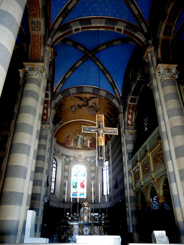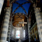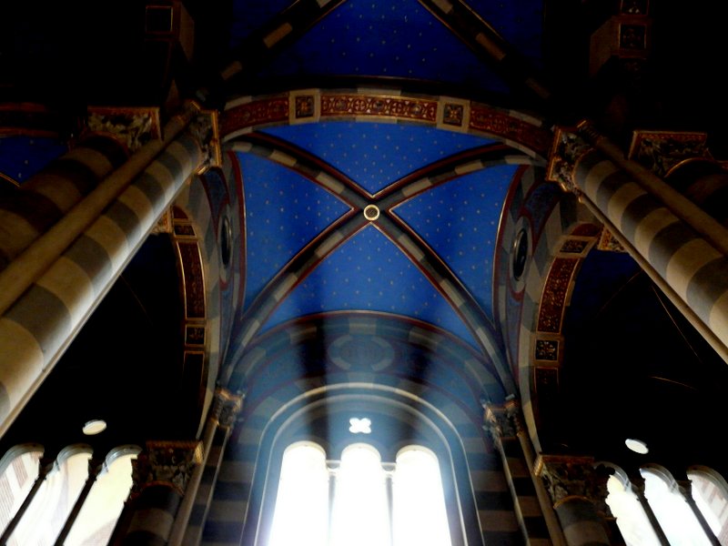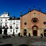 In der oben genannten Trattoria trafen wir Schweizer Gäste, die uns den Besuch von Casale Monferrato sehr ans Herz legten. An unserem letzten Urlaubstag folgten wir dieser Empfehlung und mussten erneut feststellen, dass auch dieses Barockstädtchen einen Besuch wert war. Schon Napoleon bezeichnete Casale als „citta di riguardo“ – als eine Stadt, die Aufmerksamkeit verdient. Neben vielen schönen Palästen stießen wir hier auf eine wunderbare romanische Kathedrale aus dem 11./ 12. Jahrhundert, die mit ihrem herausragenden Campanile einen Teil des Stadtbildes beherrscht. Die Licht- und Schattenspiele im Inneren des Doms brachten Farben und Formen der Einrichtung und Kunstwerke zum Leuchten, z.B. den blauen Sternenhimmel und die bemalten Rundbögen und schufen so eine unvergessliche Stimmung. Wir bummelten weiter durch die Hauptstraße Via Roma, sahen links und rechts viele alte Gebäude mit aktuellen Modegeschäften, unter den Bogengängen wurde entspannt Espresso getrunken und ein bisschen getratscht, eine entspannte Atmosphäre lud zum Verweilen ein – hier könnte man es auch mühelos länger aushalten. Die Zeit reicht bei unserem Kurzbesuch leider nicht aus, um z.B. die Festung am anderen Ufer des Po zu besuchen – immerhin stießen wir auf eine Krumirifabrikation und kauften diese köstlichen Kekse, die eine Spezialität dieser Stadt sind.