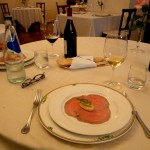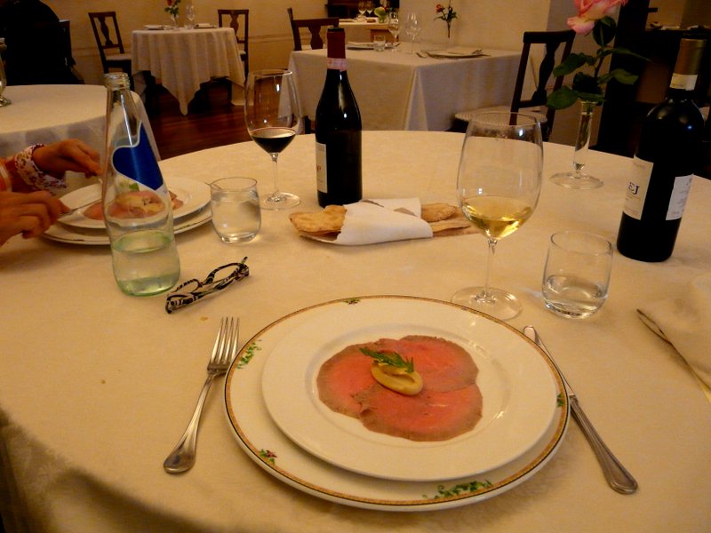 Hier feierten wir dann auch stilvoll meinen Geburtstag beim 5 gängigen Hausmenü und exzellenten Weinen. Es ist übrigens im Piemont üblich, dass man jeweils einen (Haus-) Wein auswählt und dann entscheidet, wie viel man trinkt – wenn die Flaschen nicht leer sind, werden nur die Gläser abgerechnet, das ist praktisch, zumal wenn Paare einen unterschiedlichen Weingeschmack haben.