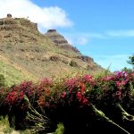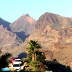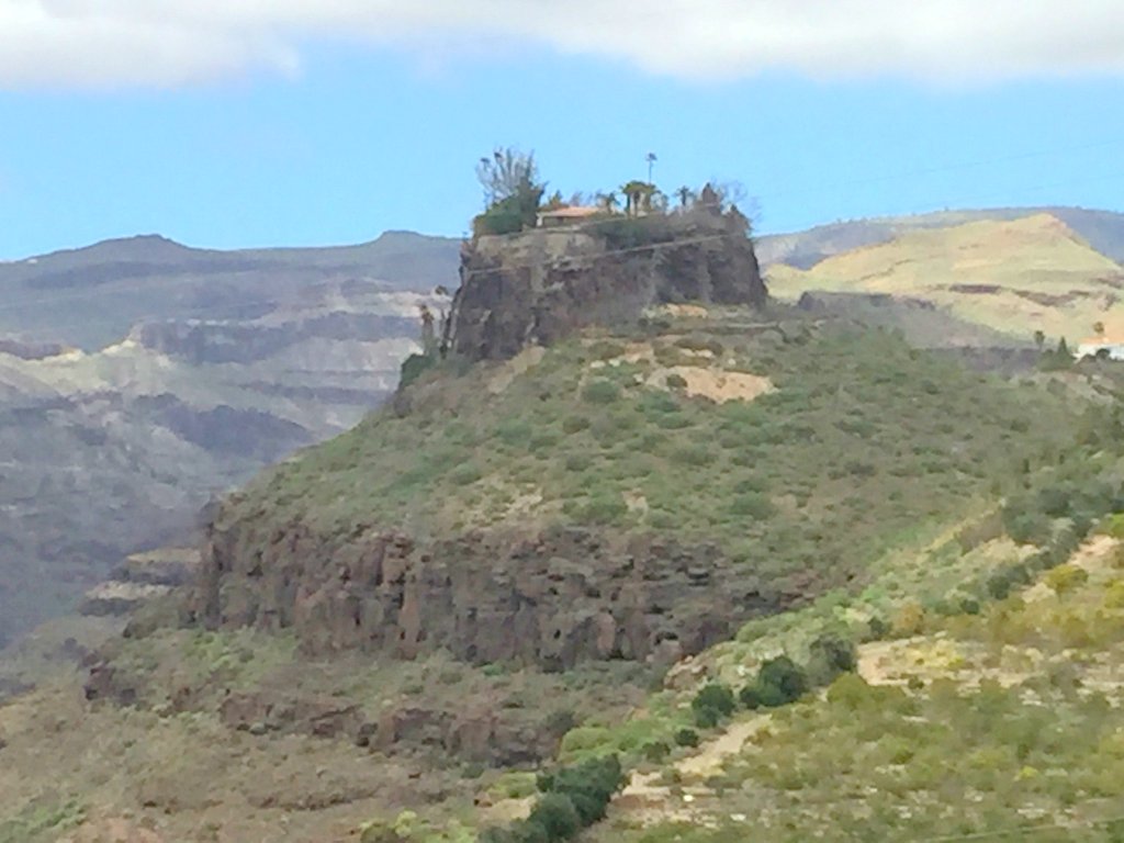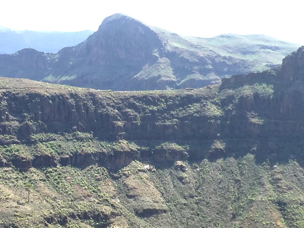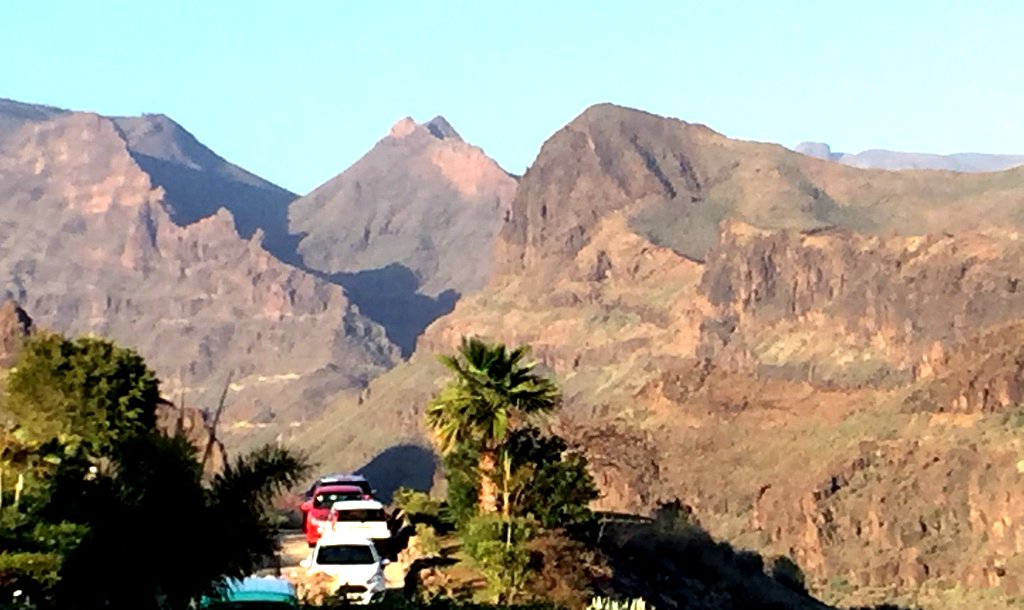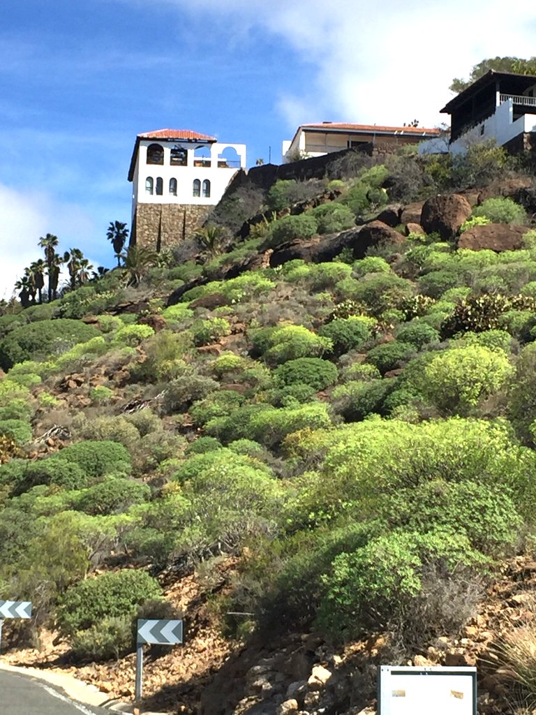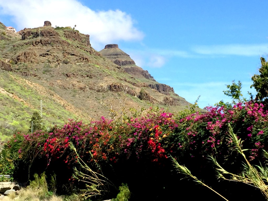 Mit dem Auto befuhren wir einen landschaftlich wunderbaren, hoch alpinen Rundkurs auf den Landesstraßen 503 /504, dessen nicht enden wollenden Steigungen im Dorf Ayagaures ihren Scheitelpunkt erreichen und dann in einer vergnüglichen Abfahrt hinunter Richtung Meer münden. Dieser steile, 12 km lange Aufstieg war von „Fahrradmasochisten“ beiderlei Geschlechts an diesem Frühlingsmorgen sehr frequentiert, mit dem Auto gehörten wir zu einer kleinen Minderheit! Auf dieser 25 Kilometer langen Runde erlebten wir erneut, quasi im Zeitraffer, die ganze Schönheit der bizarren und schroffen Bergwelt Gran Canarias, die dann in einem blumenbunten, grünen Tal ihren lieblichen Gegensatz findet.