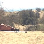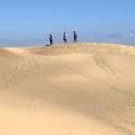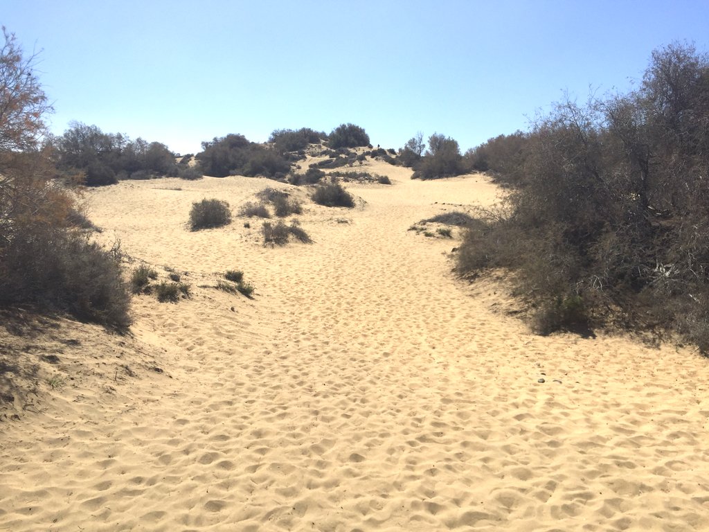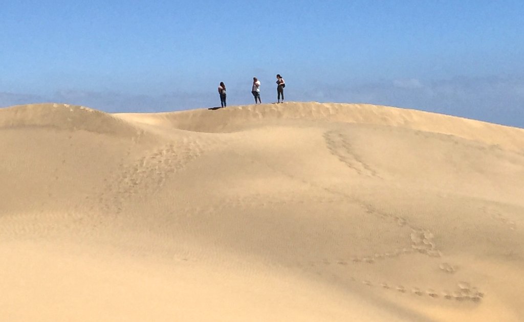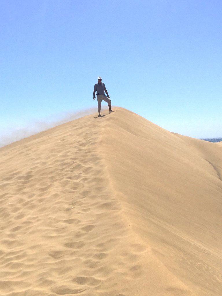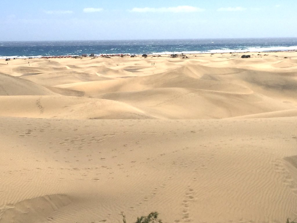 Sonne, blauer Himmel, weiße Wolken, die vielfältigen Sandtöne, schüchternes Grün an manchen Stellen und das nahe Meer bieten eine einzigartige Farbsymphonie a la Gran Canaria! In den Dünen klein die Menschen, die als Schattenrisse im Gegenlicht hinter den Dünen auftauchen und wieder verschwinden. Wunderbar, wir lieben diese Insel!