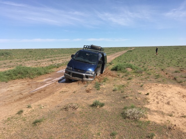 Nach 3 Wochen kommt Barbara am 22.8. und das Abenteuer beginnt. Wir hatten uns schon im Vorfeld eine Route ausgedacht, die wir abfahren wollten. Bei der Planung mussten wir erleben, dass unser Verständnis von Organisation in der Mongolei nicht geteilt wird. Hier wird nicht im Vorfeld überlegt was passieren könnte und wie man das Problem optimalerweise löst sondern man wartet bis was passiert und schaut dann was man tun kann. Bis zuletzt warteten wir auf die Bestätigung der Camps für unterwegs. Da Ganbaatar mir versichert hat, dass er 17 Jahre als Reiseleiter die Wüstentour begleitet hat und ich höflich sein wollte, haben wir Ganbaatar als Fahrer engagiert. Der 25 Jahre alten Mitsubishi Bus hat zwar 4-Wheel ist aber ansonsten schon sehr mitgenommen, was wir unterwegs mehrfach erleben mussten. Die meisten Autos sind rechts gesteuert (da gebraucht aus Japan gekauft) – der Verkehr ist aber links ausgerichtet, so dass das Überholen eines LKW immer auch ein Abenteuer ist.