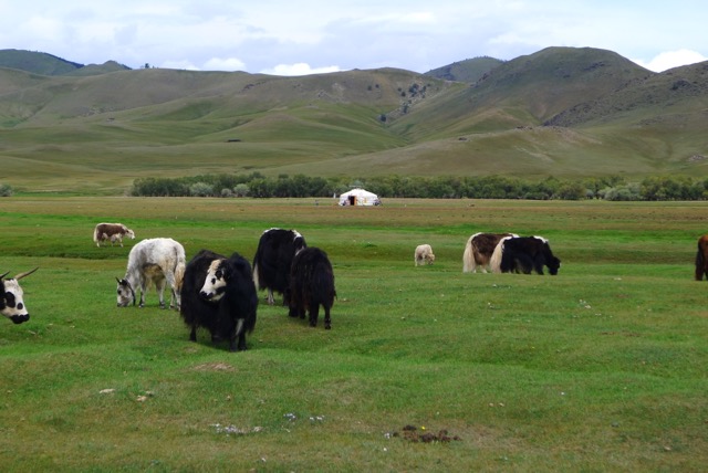 Plötzlich ein abgestecktes Polofeld neben einer Jahrtausende alten Steele und Steinschildkröte. Aus dem edlen Camp dringt Klaviermusik. Das muss ich mir anschauen – in einem der Gers sitzt eine junge Frau an einem Steinwayflügel und spielt klassische Musik. Auf dem Rückweg begegnet mir eine bereits vom Flug Berlin-Ulaanbaatar bekannt Person (eine exzentrische Erscheinung mit grauen Haaren, schwarzer Kleidung im japanischen Stil und Borsalino), die ich auf englisch anspreche. Die Antwort kommt prompt auf deutsch: ich bin der Christopher aus Berlin- der Besitzer des Camps. Er bietet im Sommer Polo-Training für internationale Gäste (gemeinsam mit Jugendlichen aus der Gegend) an. Stolz zeigt er uns sein Camp: nachhaltig, mit lokalen Produkten und durch lokale Handwerker aufgebaut. Im Küchen-Ger schnippeln Frauen aus der Umgebung Gemüse und bereiten das Mittagessen vor. Ein Badezelt (Holzzuber) und Massage- und Yogazelt sorgen für Entspannung und für die jugendlichen Reiter gibt es ein Internetzelt, in dem telefoniert und das Web genutzt werden kann. Alles nachhaltig und extrem hochwertig gemacht- wir sind überrascht und begeistert. Buchen kann man das Camp nicht – man wird eingeladen. Im Tal grasen die über 100 Polopferde, die auch im Winter von Einheimischen betreut werden.