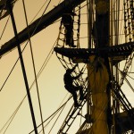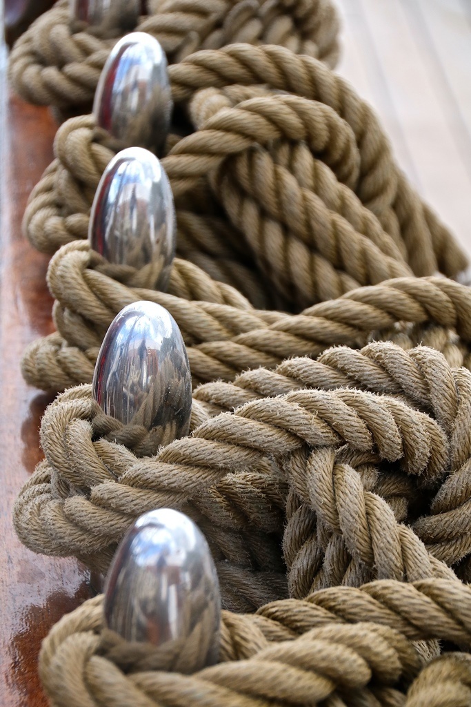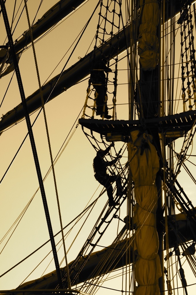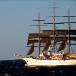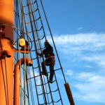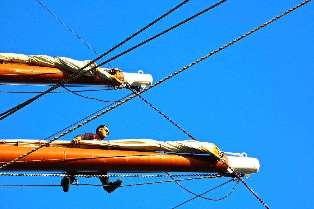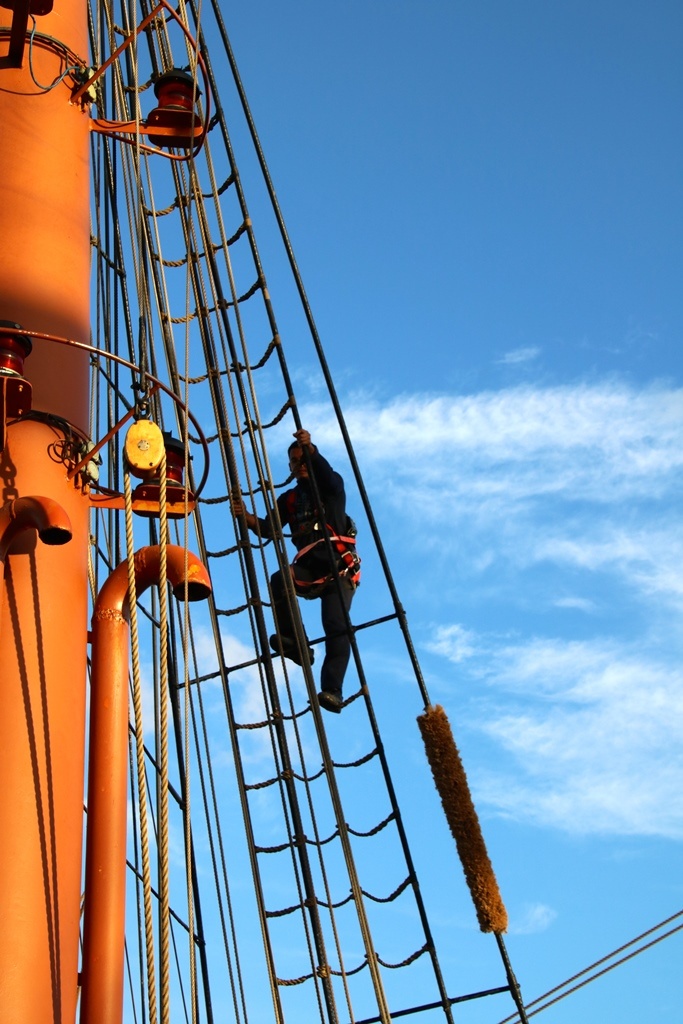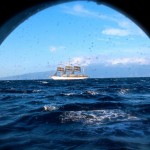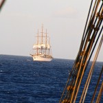 Aber, das bringt einen Seemann nicht um, dachte ich, und begab mich an Deck. Dort wartete bereits Liza, klein und energisch, um die Gäste mit ihrem Frühsportprogramm „Fit für den Tag“ zu machen. Das Problem: es war niemand da – außer mir! Da zudem das Schiff immer noch heftig schwankte (das Heck, auf dem wir standen, hob und senkte sich um ca. 8-10 Meter) entschlossen wir uns keine besonderen Übungen zu machen, sondern zu 10 Runden power-walking rund ums Schiff, was immerhin 1,8 km ausmachte. Das brachte mir einerseits Komplimente von Liza ein, andererseits eine Verschlechterung meines Magengefühls, sodass ich auf dem Weg zurück in die Kabine beim Bordarzt einen Stop einlegte, um dies mit einer Tablette zu bekämpfen! Das klappte auch, allerdings mit der bekannten Folge von Müdigkeit! Die wurde dann durch die Aktivitäten der Segelcrew vertrieben, als sie begannen in die Takelage zu klettern und die ersten Segel zu setzen – nicht alle, der Seegang war noch immer ziemlich stark .