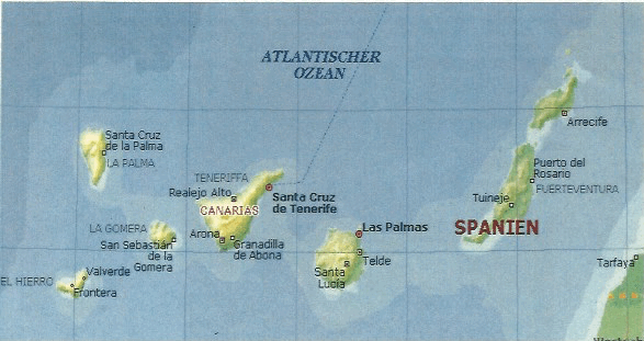Die Kanarischen Inseln (spanisch Islas Canarias), auch Kanaren genannt, ist eine Inselgruppe im Atlantischen Ozean vor der Nordwestküste Afrikas. Die Kanaren, ehemals eine zusammengehörende Provinz, wurden 1927 in zwei Provinzen geteilt, die eine autonome Region Spaniens darstellen, bestehend aus den Provinzen Las Palmas und Santa Cruz de Tenerife. Die Hauptstädte der Provinzen sind Las Palmas auf Gran Canaria und Santa Cruz de Tenerife auf Teneriffa. Zu den Kanarischen Inseln gehören (in der Reihenfolge ihrer Größe): Teneriffa. Fuerteventura (das dem Festland am nächsten liegt), Gran Canaria. Lanzarote, La Palma, Gomera und Hierro sowie mehrere kahle Eilande. Die Gesamtfläche der Inseln beträgt 7.273 Quadratkilometer.